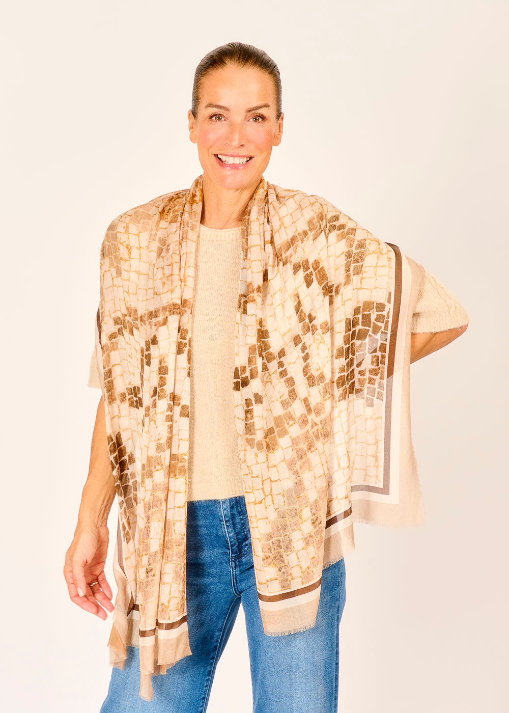 Dieses stilvolle Tuch mit seinem einzigartigen Mosaik-Muster in warmen Erdtönen ist ein wahrer Blickfang und verleiht jedem Outfit eine künstlerische Note. Das leichte Material schmiegt sich sanft an und ist der perfekte Begleiter für kühle Abende oder um Ihren Look gekonnt abzurunden. Dank seines zeitlosen Designs lässt es sich vielseitig kombinieren und wird schnell zu einem Ihrer Lieblingsaccessoires.