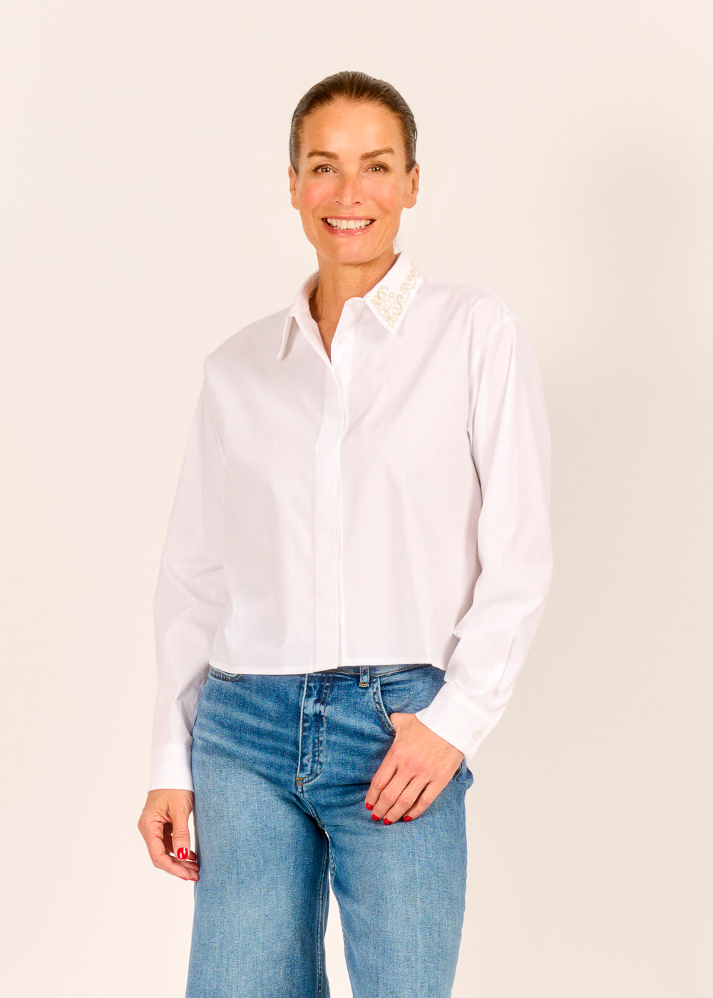 Verleihe deinem Business-Look eine romantische Note mit dieser weißen Bluse. Die feine Stickerei am Kragen setzt ein edles Detail und macht sie zum perfekten Begleiter unter Strick. Gefertigt aus einem angenehmen Material, bietet sie dir den ganzen Tag über hohen Tragekomfort und eine stilvolle Ausstrahlung.