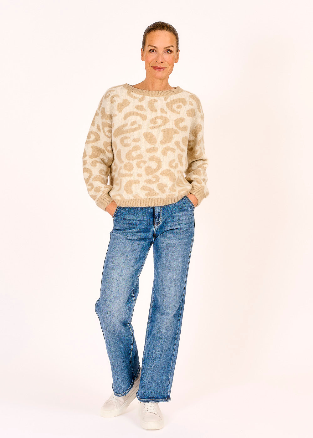 Dieser Pullover mit modischem Animalmuster in Beige setzt einen trendigen Akzent in deiner Garderobe. Der weiche Stoff sorgt für ein angenehmes Tragegefühl, während das auffällige Muster einen modernen, stylishen Look kreiert. Perfekt für einen urbanen, lässigen Stil lässt sich der Pullover vielseitig kombinieren und ist ein echter Hingucker.