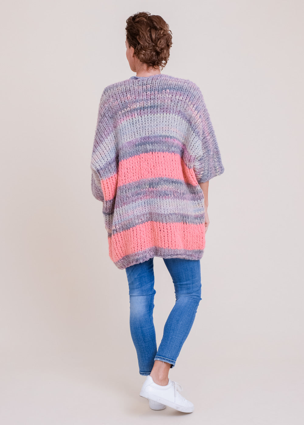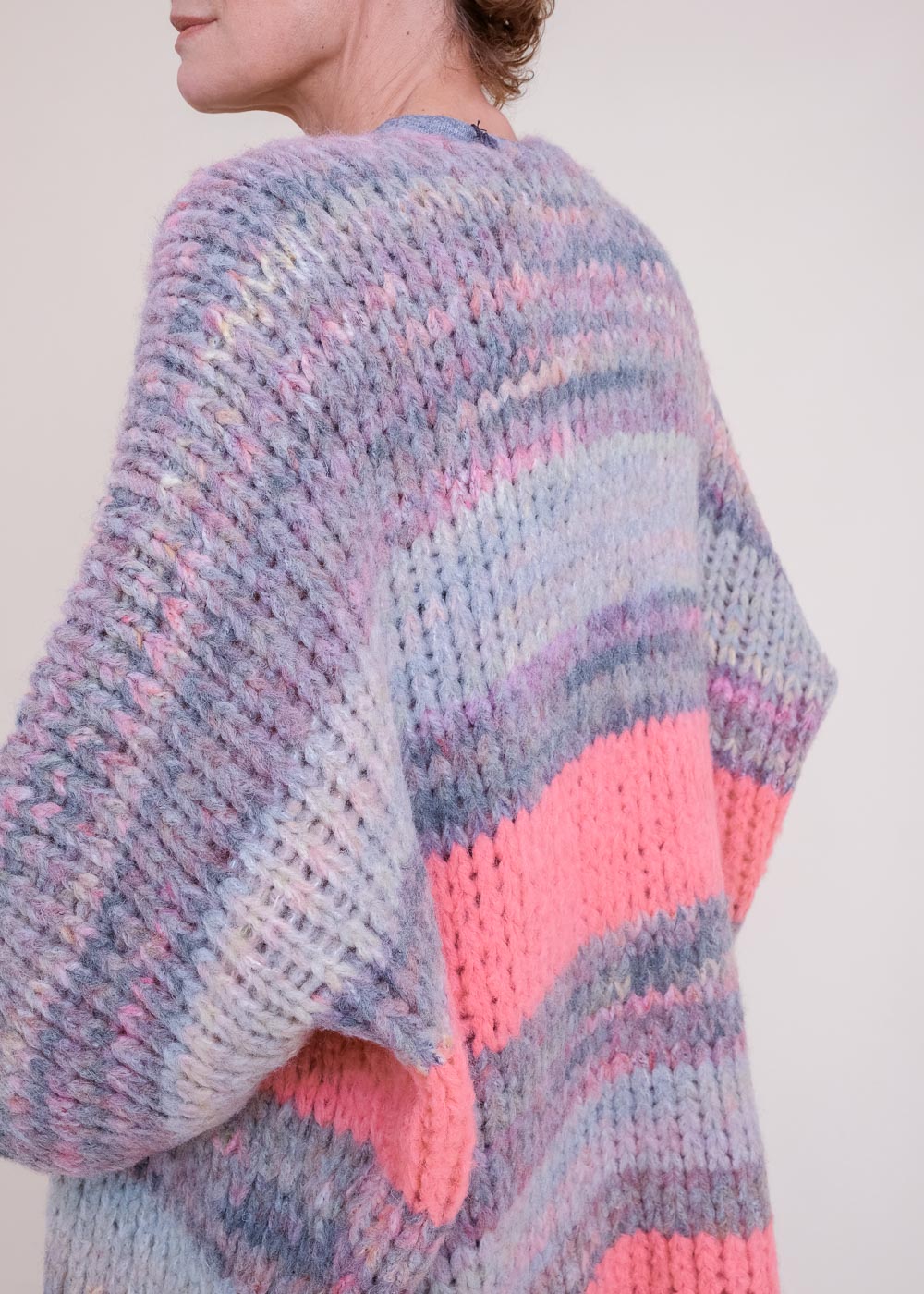 Diese lässige, offene Fashionstrickjacke mit ihrem besonderen Design passt perfekt zu hellen Oberteilen und Jeans. Sie hat einen dreiviertel Arm. Ein absoluter Trendsetter Artikel. Länge:76cm.