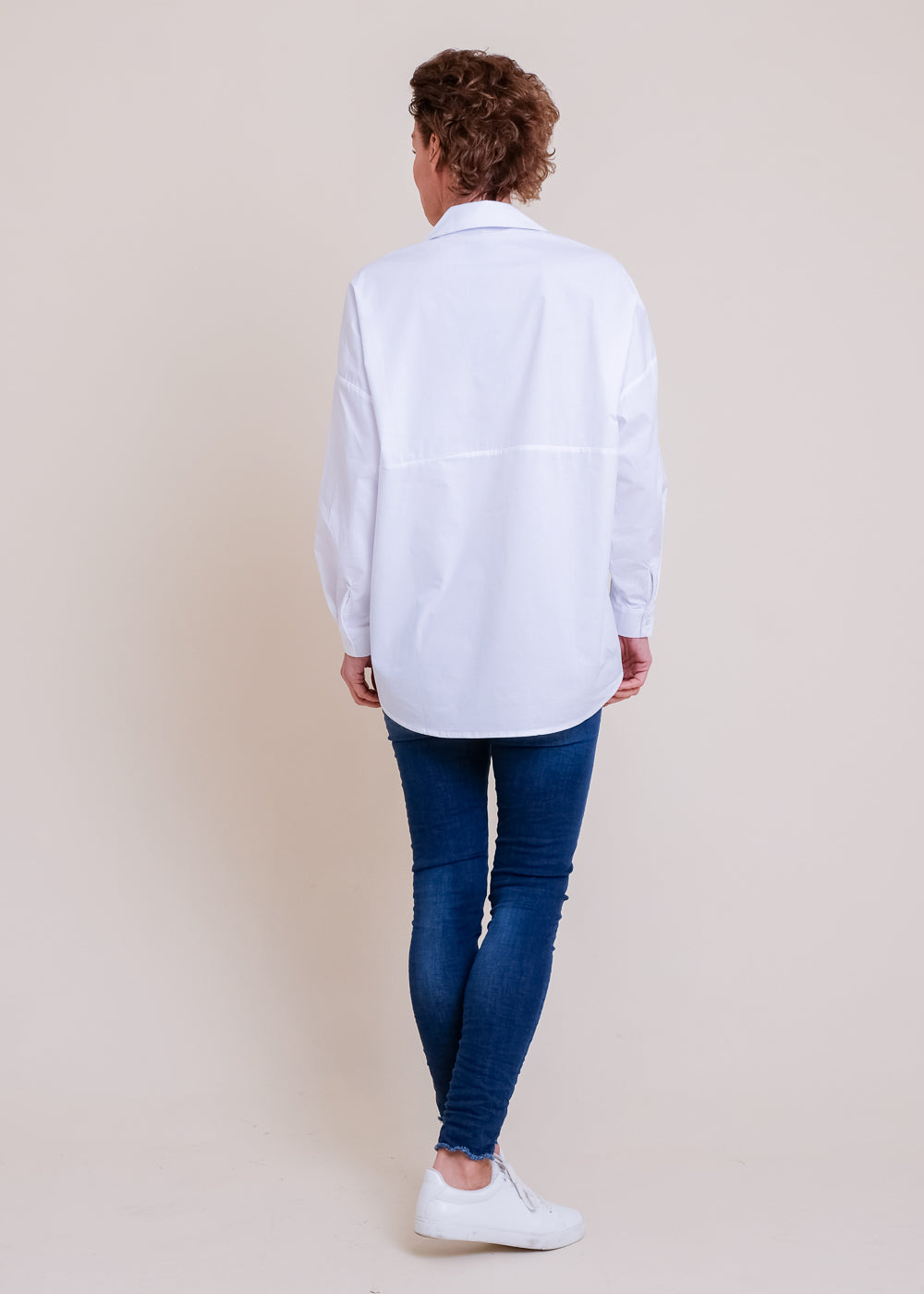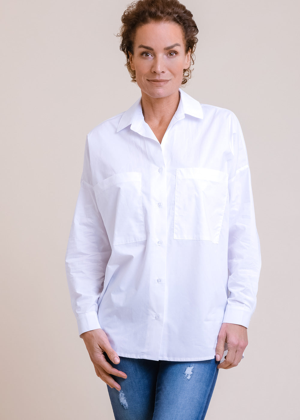 Ein Klassiker, der in keinen Kleiderschrank fehlen darf: Unsere Bluse in reinem Bianco - Ottico. Die Bluse ist langärmelig und besitzt einen Stehkragen, der nach Wunsch offen oder hochgeschlossen getragen werden kann. Die aufgesetzten Taschen auf Brusthöhe verleihen dieser Bluse ein modernes Design.
