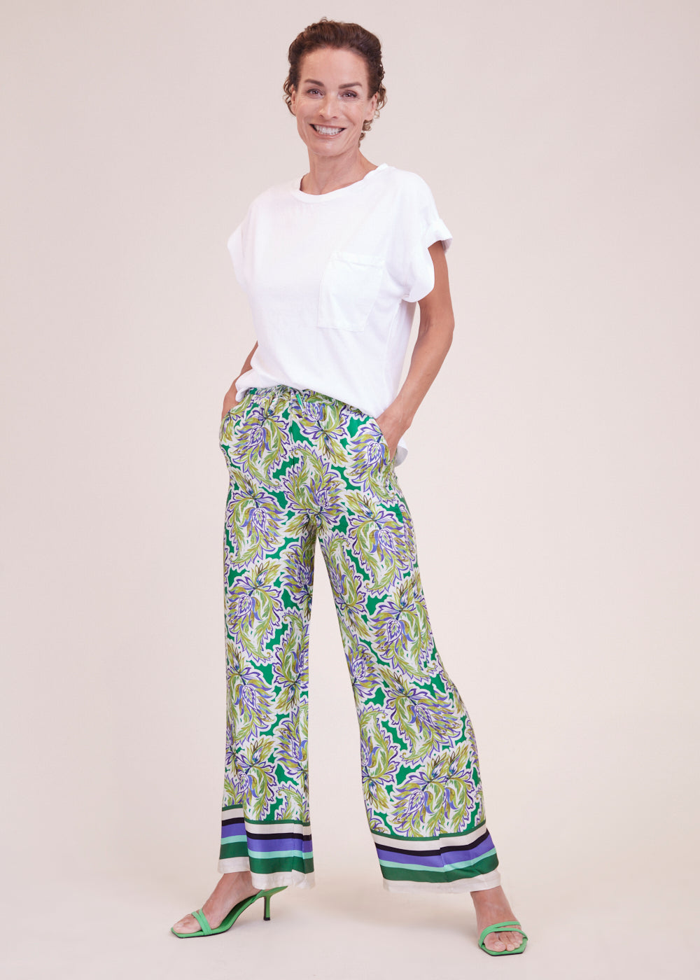 Raffinierte Hose mit ausgestelltem Bein und All-Over-Print in frischen Sommerfarben. Der Bund ist mit einem Gummizug versehen für ein super leichtes Tragegefühl. Besonders schön in Kombination mit der passenden Bluse und ein echtes Must-Have für den kommenden Sommer.