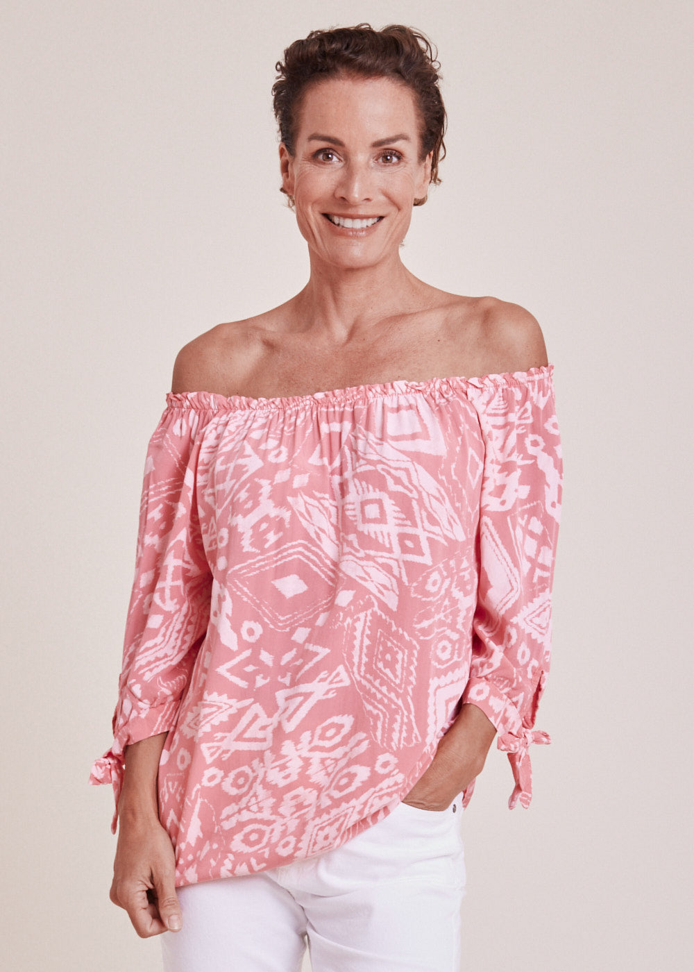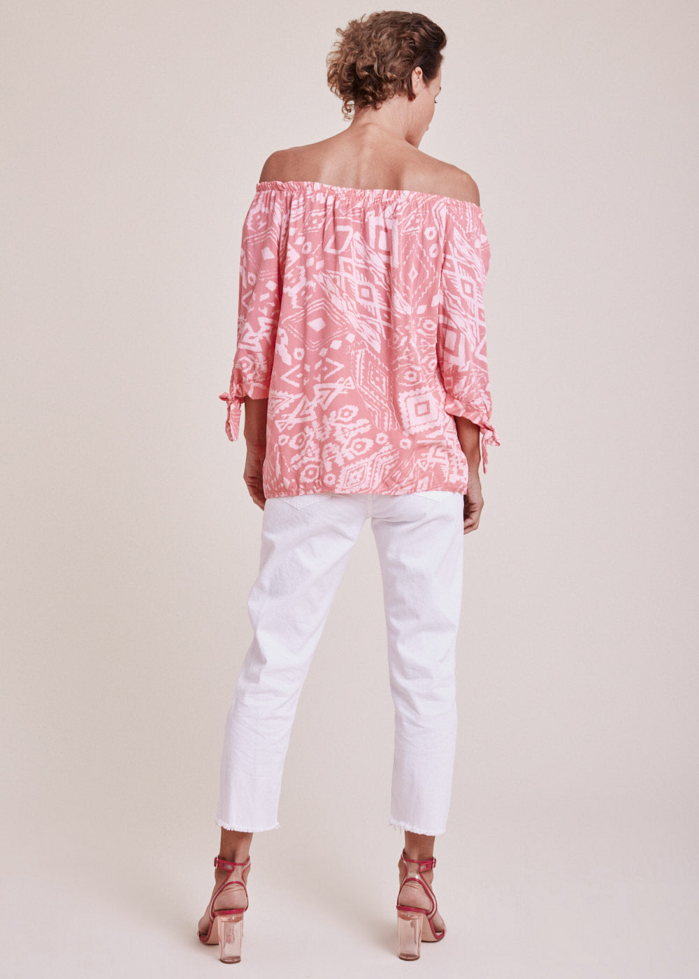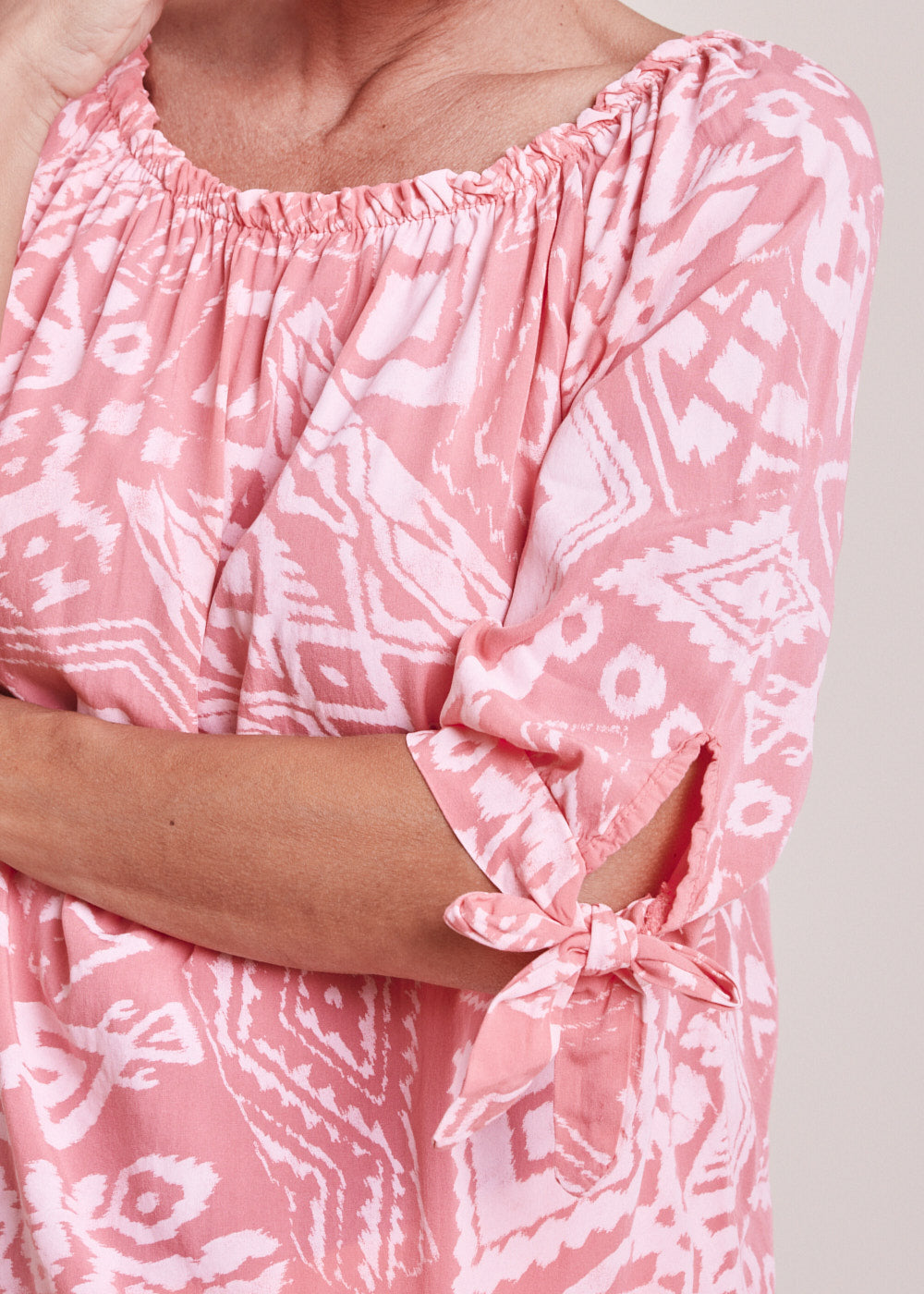 Elegante Bluse mit Carmen-Ausschnitt im pinken All-Over-Print. Die Bluse bietet durch den Gummizug im Ausschnitt Variation für dein Styling. Die 3/4-Ärmel sind leicht ballonartig geschnitten und werden am Bündchen mit einer Schmuckschleife geschlossen. Das Oberteil fällt locker um den Oberkörper.
