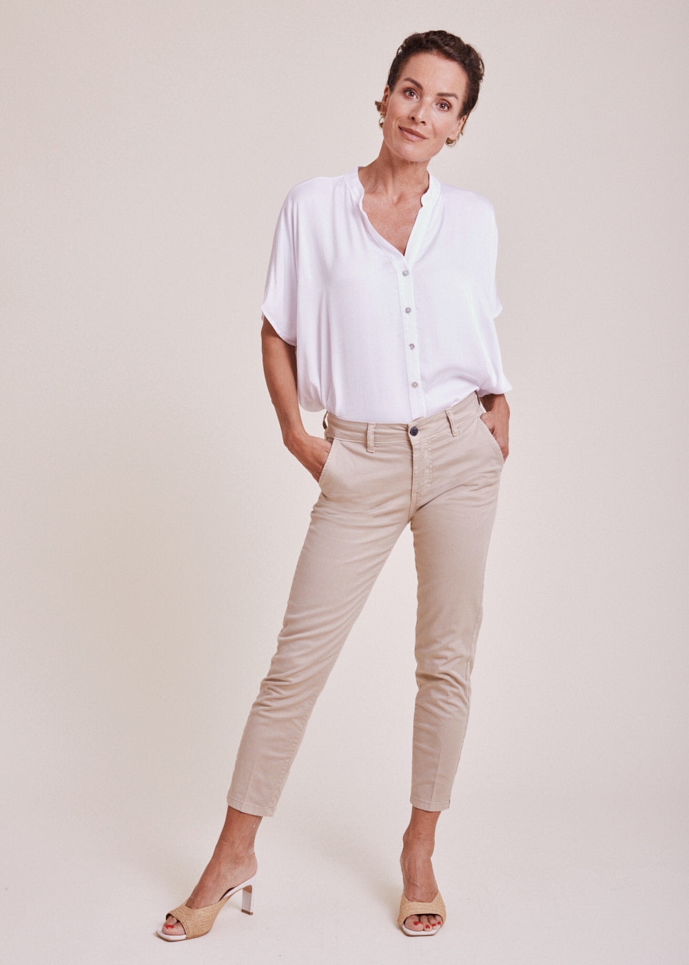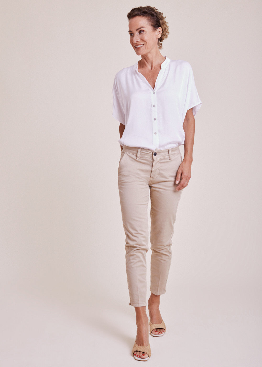 Chino-Hose mit normaler Leibhöhe und schmal zulaufendem Bein. Die Chino schließt mit Knopf und Reißverschluss. Die Bügelfalten entlang des Oberschenkels schmeicheln der Figur. Die Hose besitzt seitliche Eingriffstaschen und geknöpfte Paspeltaschen am Gesäß und überzeugt durch ihre elastische Baumwollqualität. Die Chino hat eine verkürzte Länge.