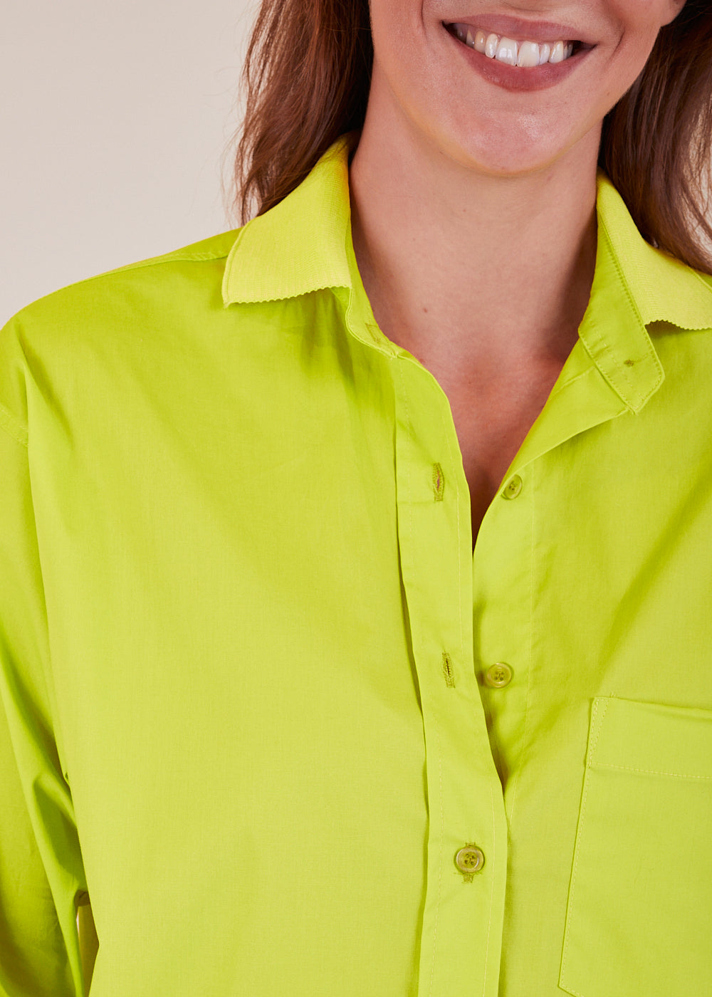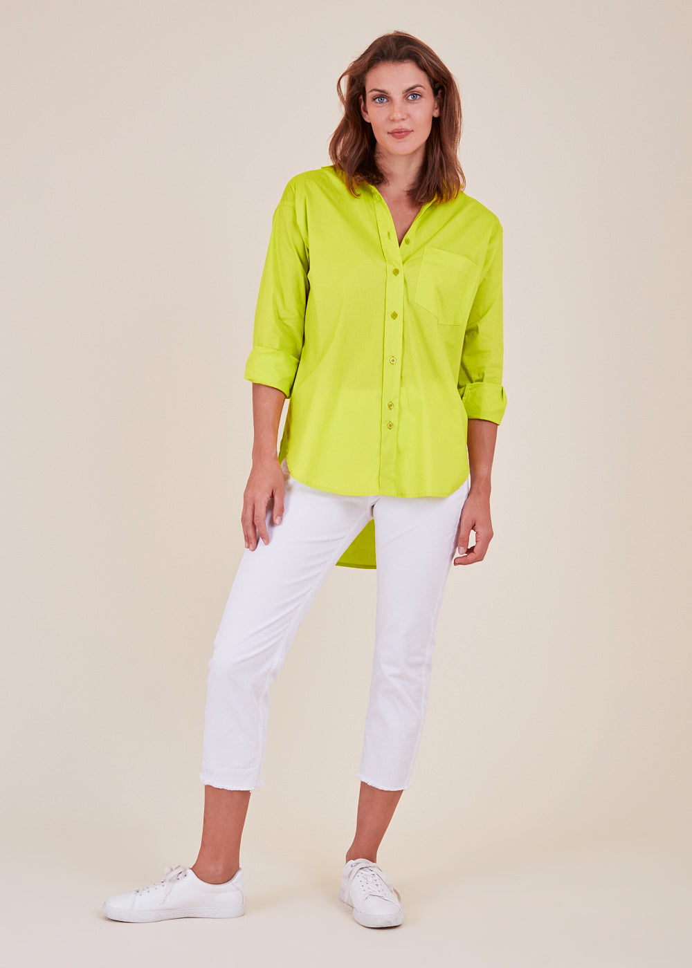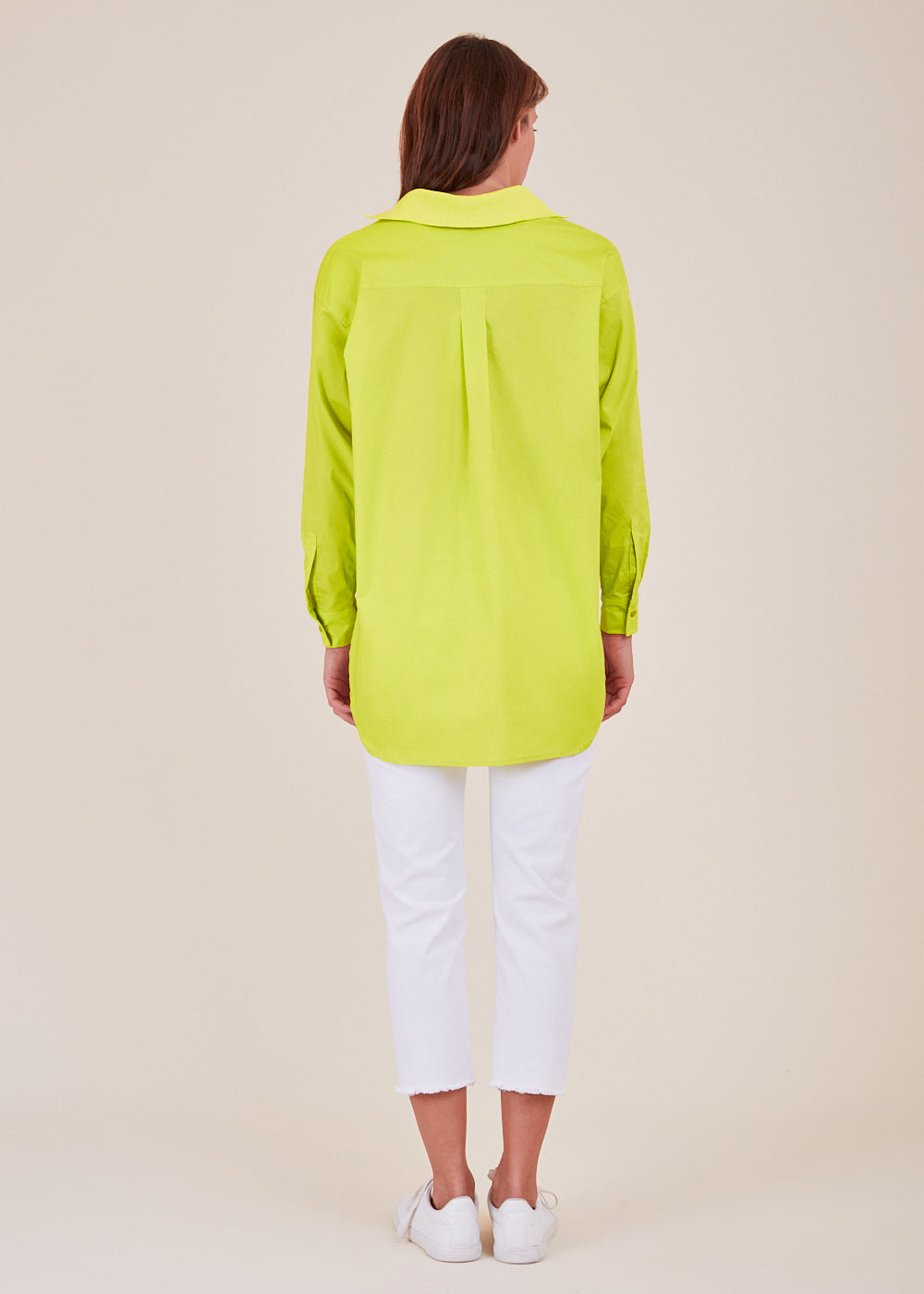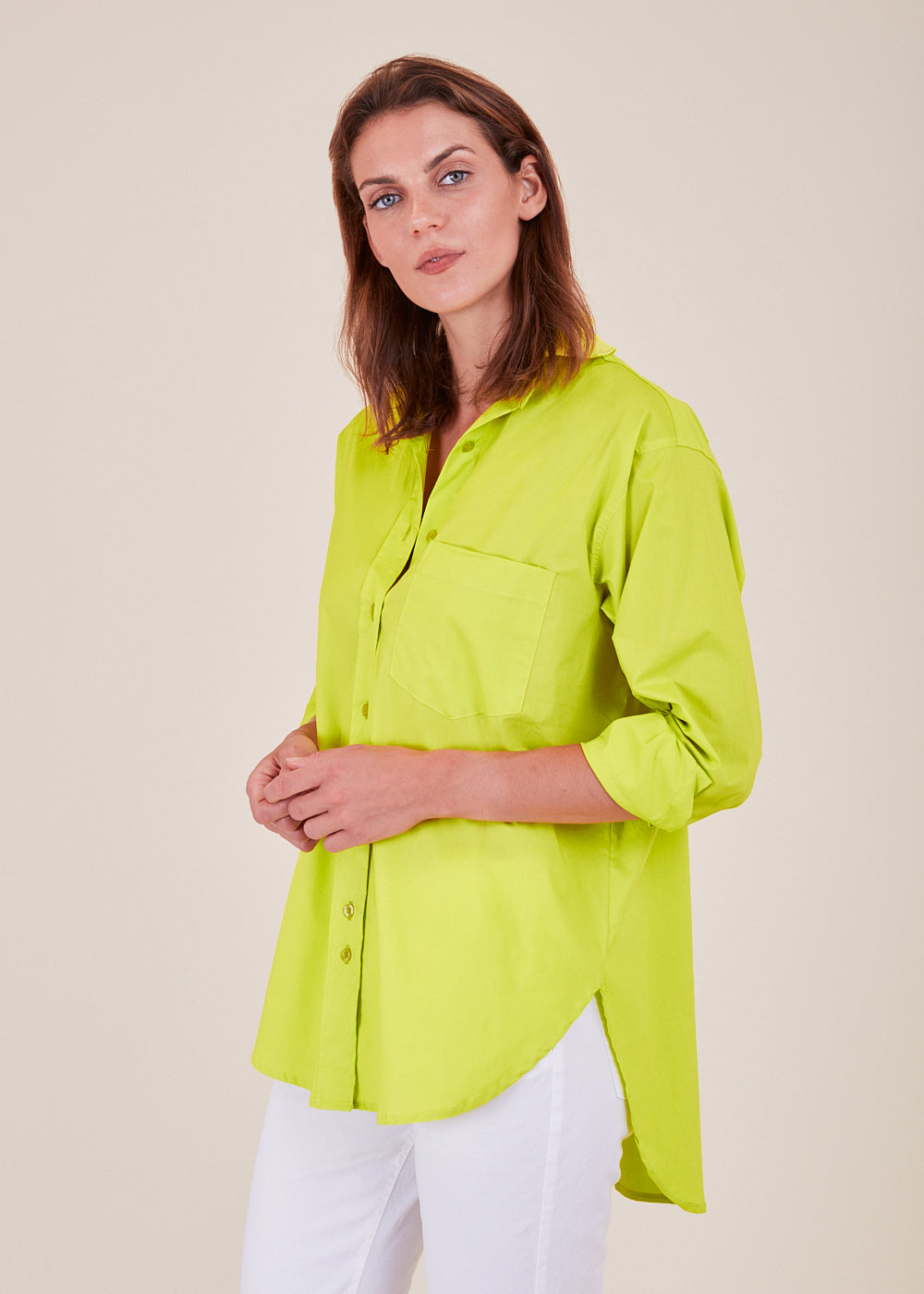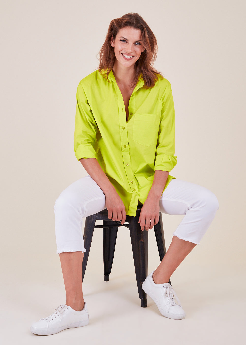 Fantastische Oversized-Bluse mit Polokragen. Die Bluse hat lange Ärmel, eine aufgesetzte Tasche auf Brusthöhe und eine durchgezogene Knopfleiste. Die Bluse ist asymmetrisch geschnitten und verlängert sich nach Hinten.