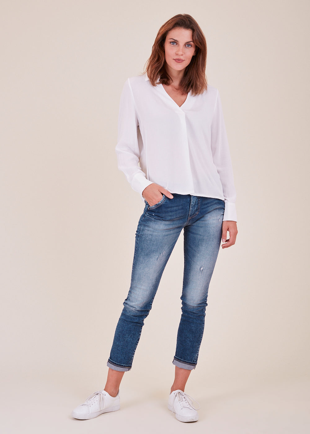 Weiße Crepe-Bluse in geradem Schnitt mit langen Ärmeln. Die Bluse hat einen kleinen Kragen und einen V-Ausschnitt, der in eine Kellerfalte mündet. Die Ärmelbündchen haben eine Manchetten-Optik.