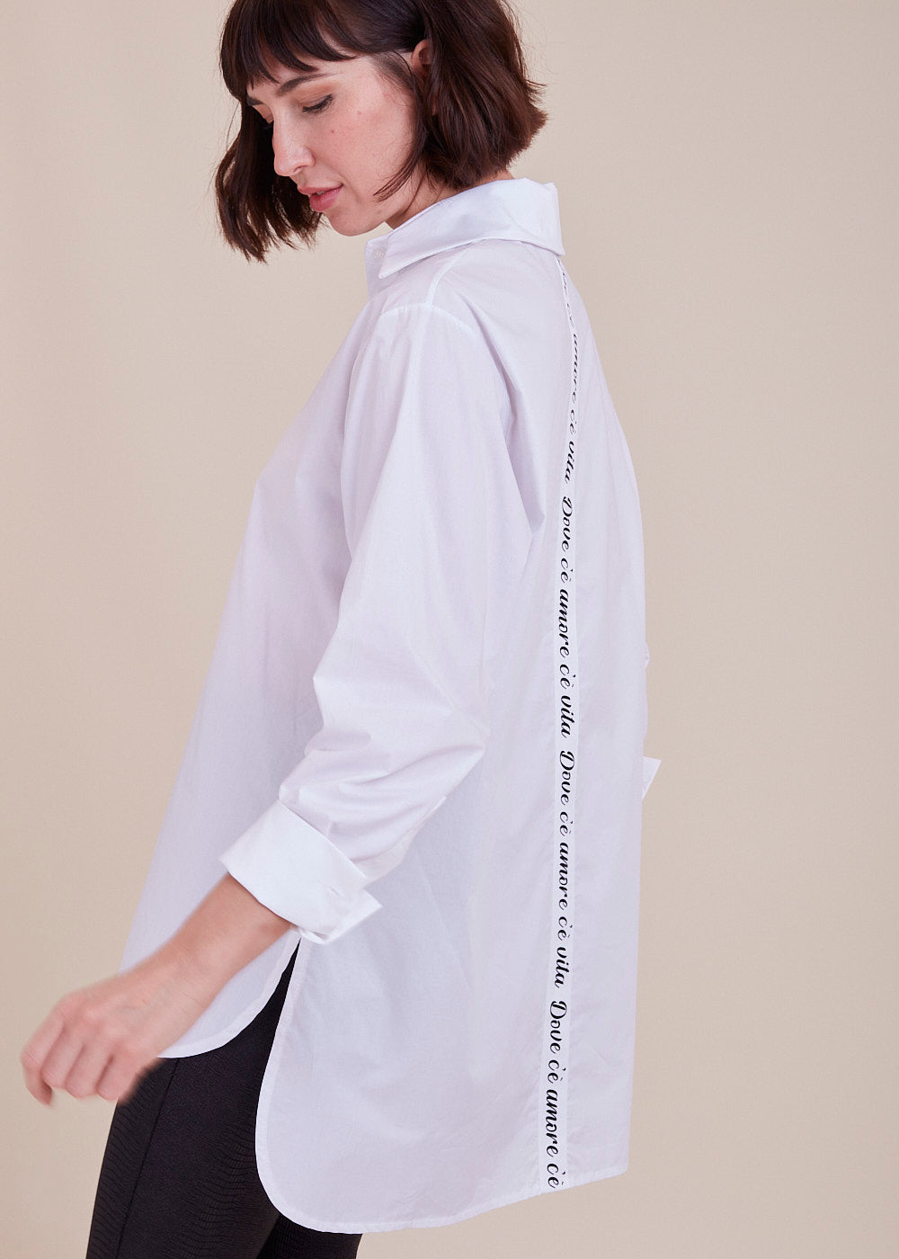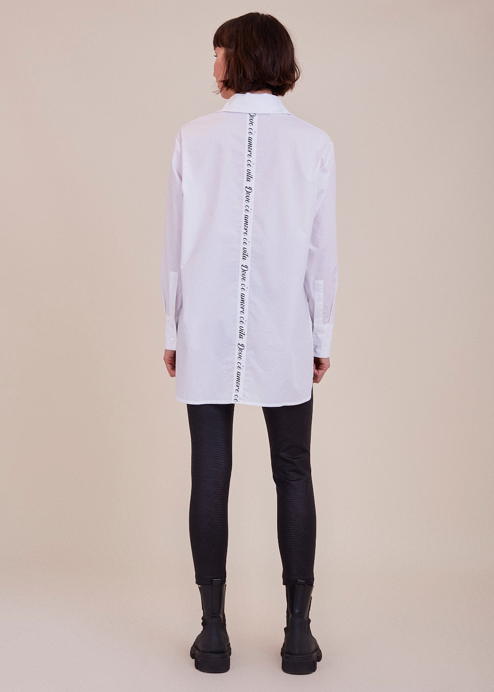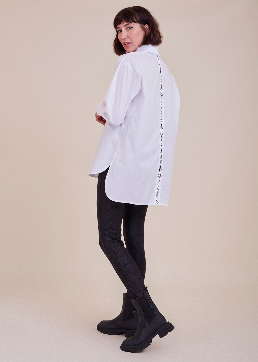 Tolle Oversized-Bluse mit Rippsband und Schriftzug auf der Rückseite. Die Bluse hat lange Ärmel, einen Hemdblusenkragen und mündete in eine durchgezogene Knopfleiste. Sie ist vorne kürzer geschnitten als hinten und ist zusätzlich mit kleinen Schlitzen an den Seiten versehen. Einfach besonders!