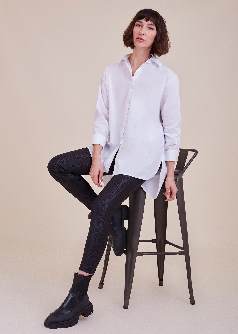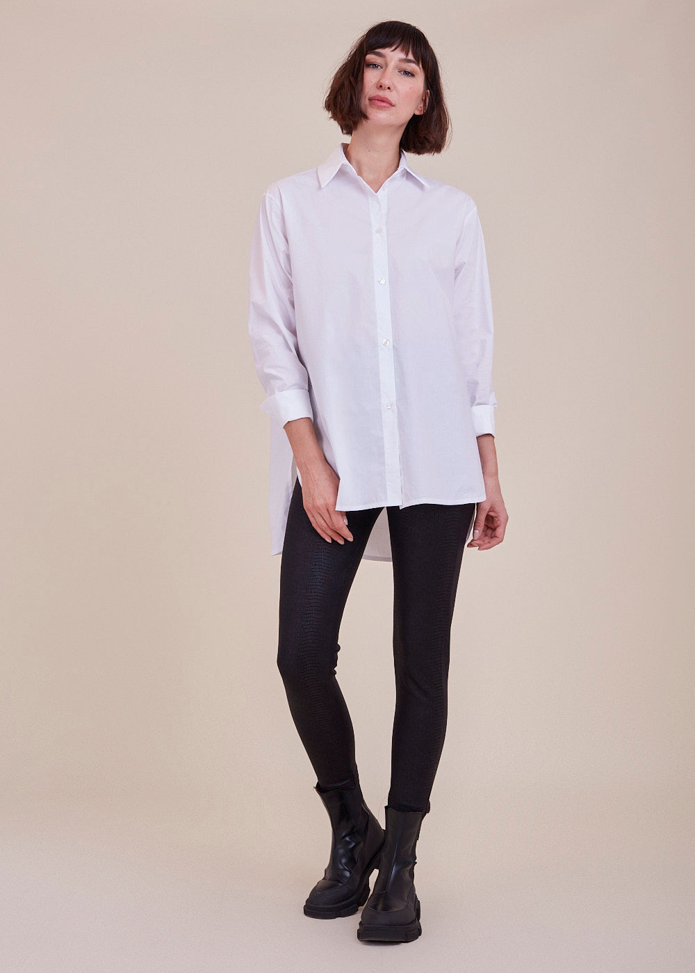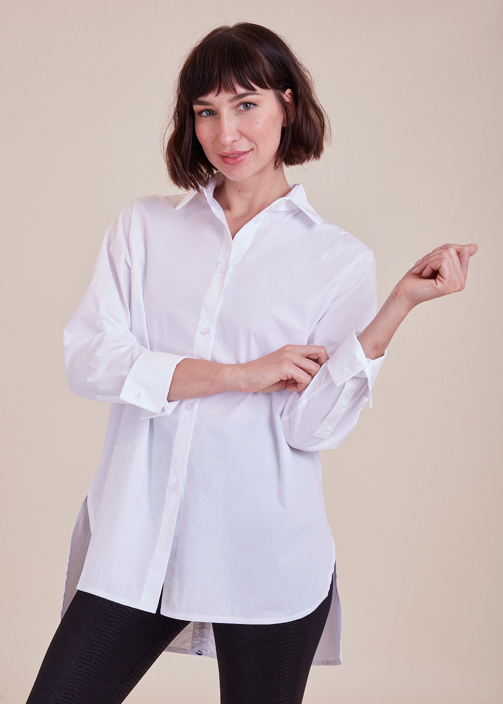 Tolle Oversized-Bluse mit Rippsband und Schriftzug auf der Rückseite. Die Bluse hat lange Ärmel, einen Hemdblusenkragen und mündete in eine durchgezogene Knopfleiste. Sie ist vorne kürzer geschnitten als hinten und ist zusätzlich mit kleinen Schlitzen an den Seiten versehen. Einfach besonders!