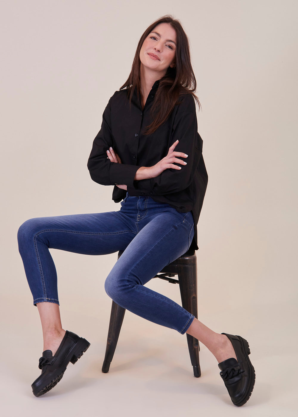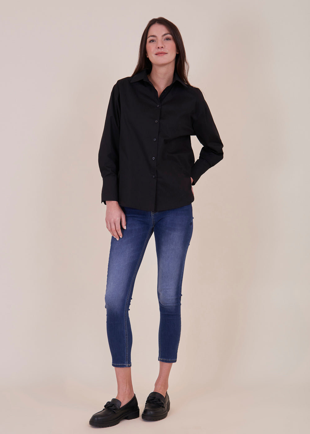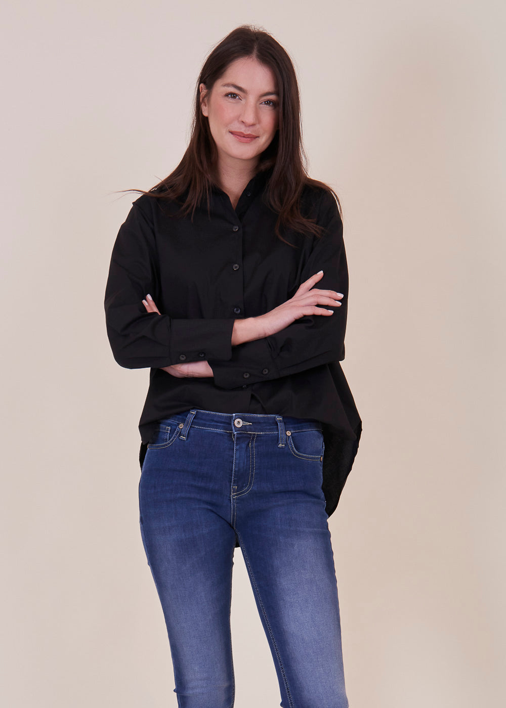 Wundervoll geschnittene Bluse aus Baumwolle mit Hemdkragen und Knopfleiste. Mit besonderem Cut-out auf den Rücken. Die Bluse hat lange Ärmel, die sich ebenfalls mit Knöpfen verschließen lassen. Die Schultern sind leicht überschnitten. Ein absoluter Hingucker.