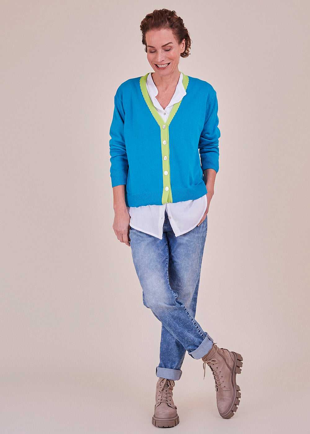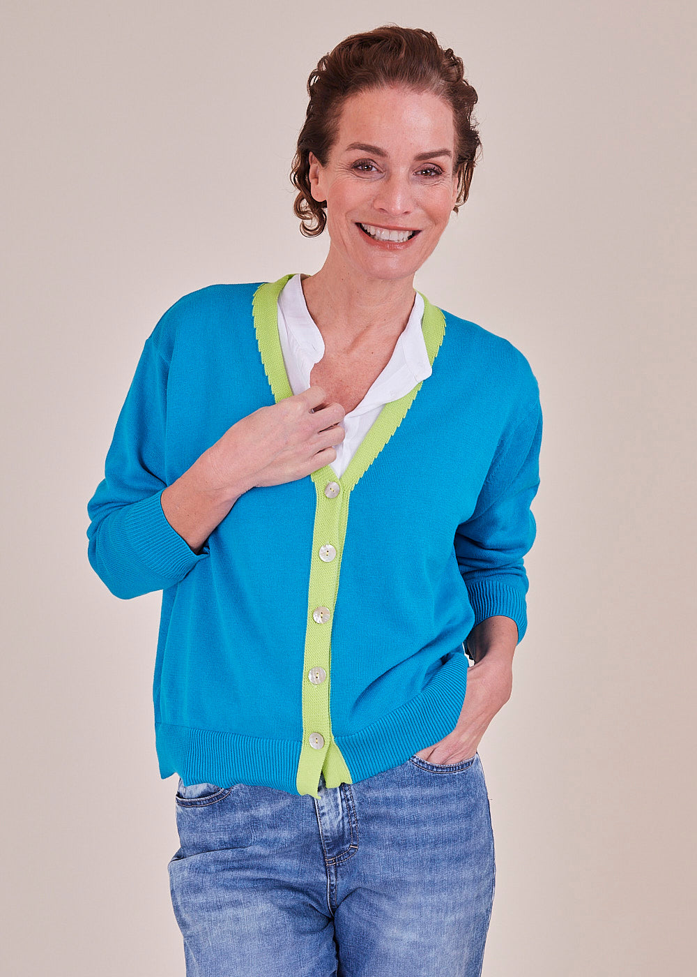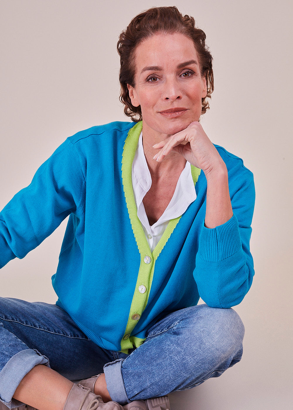 Einfach Zauberhaft! Diese kurz und kastenförmig geschnittene Strickjacke mit langen Armen aus unserem Bestseller Garn. Sie hat ein Rippenbündchen an den Ärmeln und am Saum. Durch die Frontknöpfe lässt sich diese Jacke wunderbar geschlossen tragen. Zum darunter tragen empfehlen wir dir unsere Basic Tops. Kuschelig weicher Tragekomfort mit absoluter Wohlfühlgarantie.