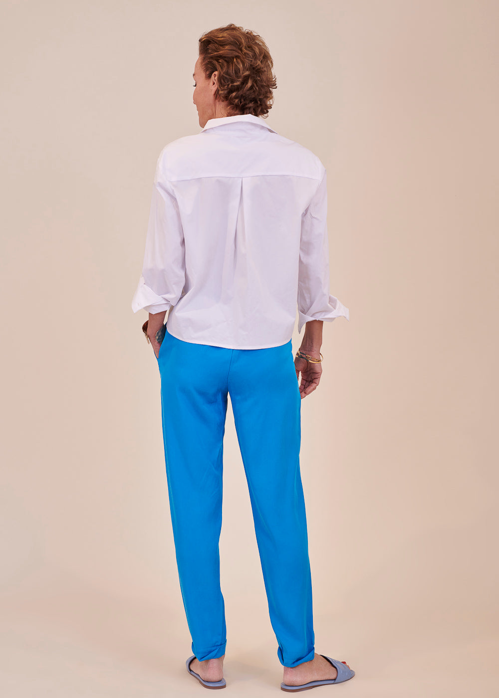 Die elastische Schlupfhose mit lockeren Bein hat einen breiten elastischen Bund für ein besonders bequemes Tragegefühl. Mit seitlichen Eingriffstaschen und Bundfalten. Die fließende Viskose kühlt an den heißen Sommertagen.