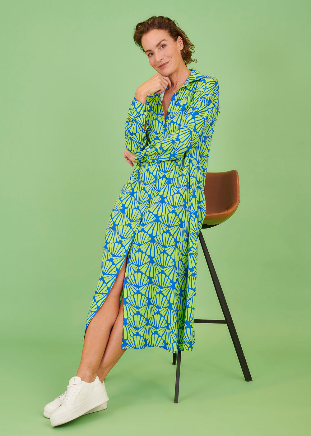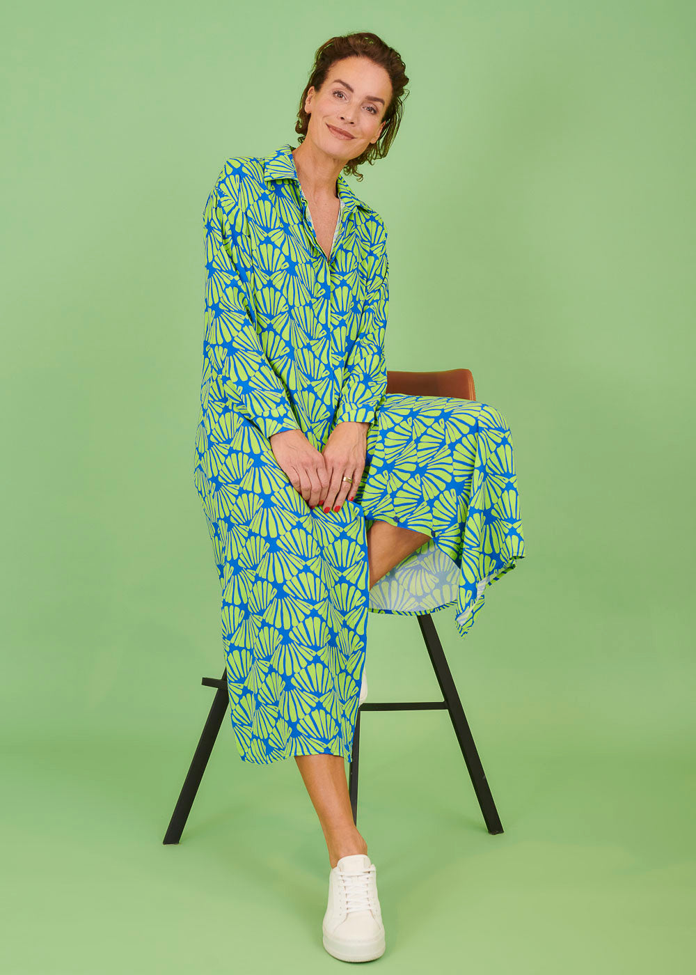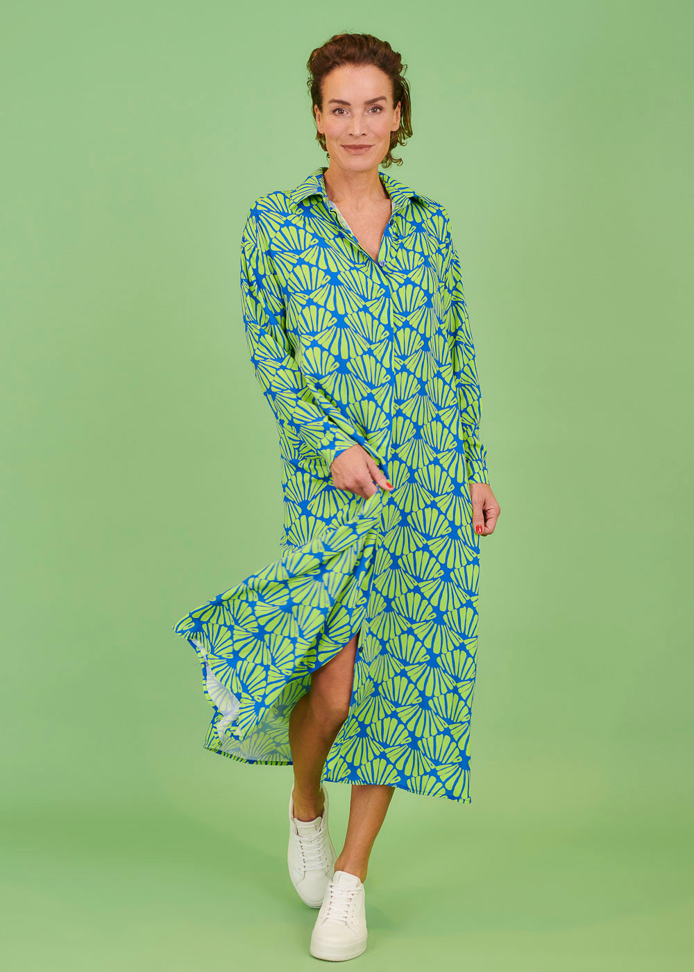 Maxi-Kleid mit durchgezogener Knopfleiste im All-Over-Print. Das Kleid hat einen Hemdblusenkragen und lange Ärmel, die je nach Bedarf hochgeshoppt werden können.