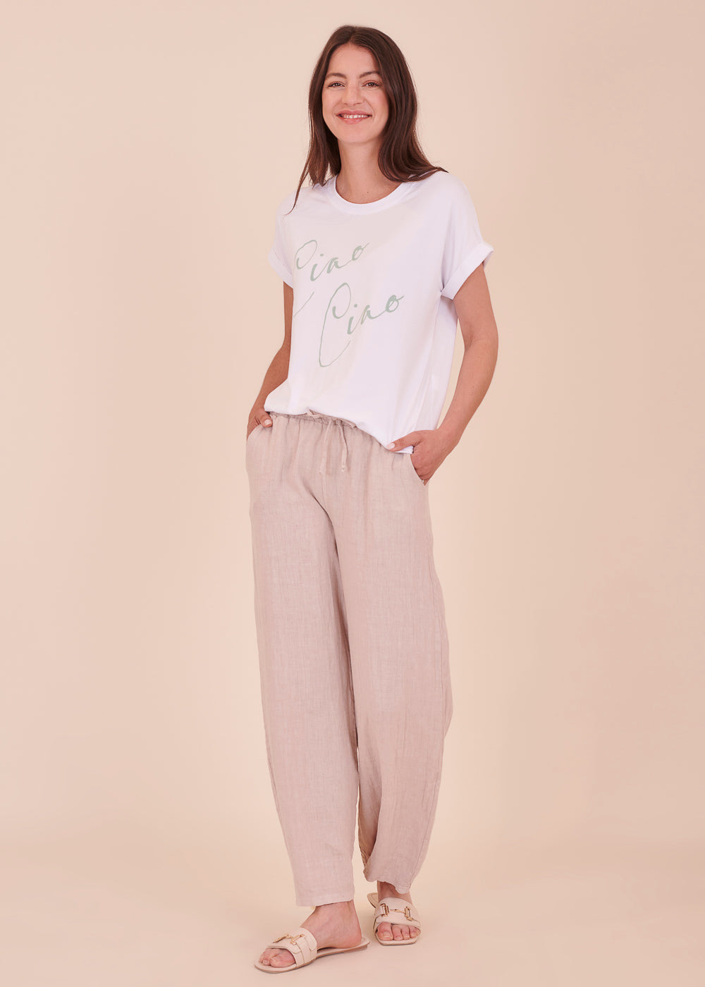Ciao Ciao! T-Shirt aus weicher Baumwolle mit Frontdruck, Rundausschnitt mit Rippenblende und überschnittenen Schultern und umgekrempelten Ärmeln.