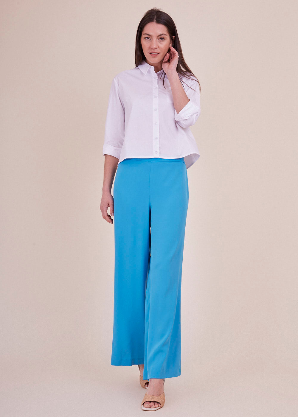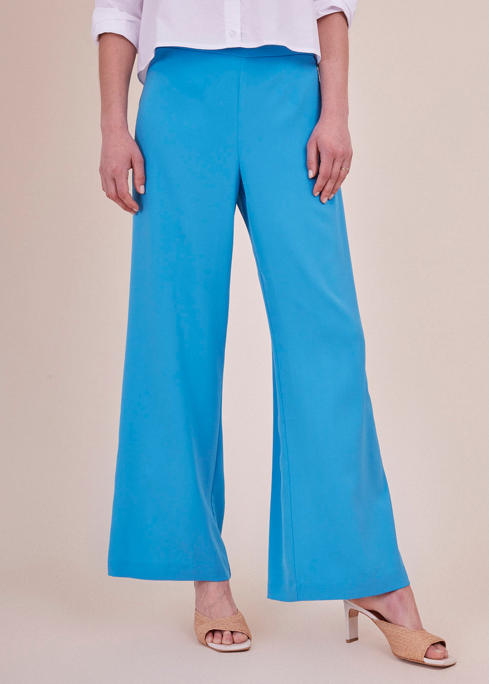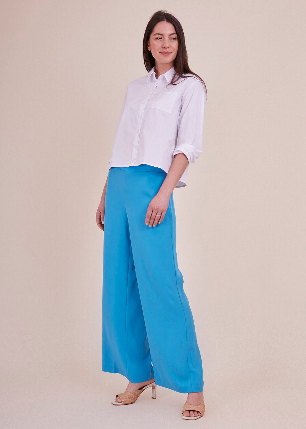 Eine elegante Begleiterin: die Hose mit weitem Bein punktet mit ihrer Ausstrahlung. Der wunderschöne blau Ton erinnert an das Meer. Besonders schön in der Kombination mit einem Absatzschuh. Ein echter Traum.