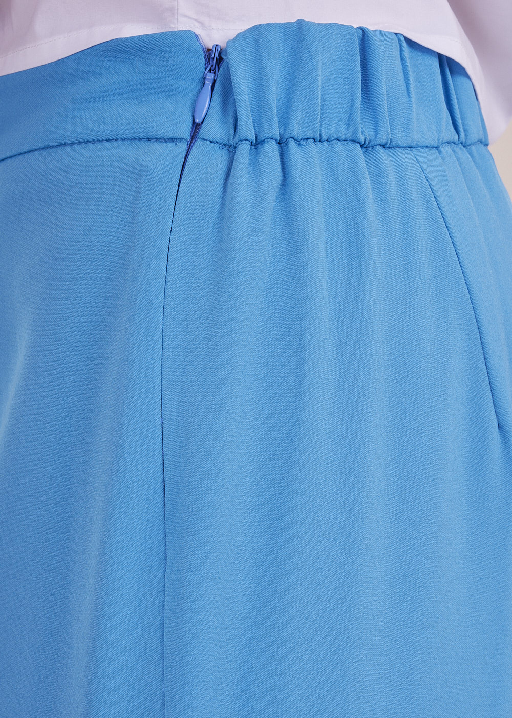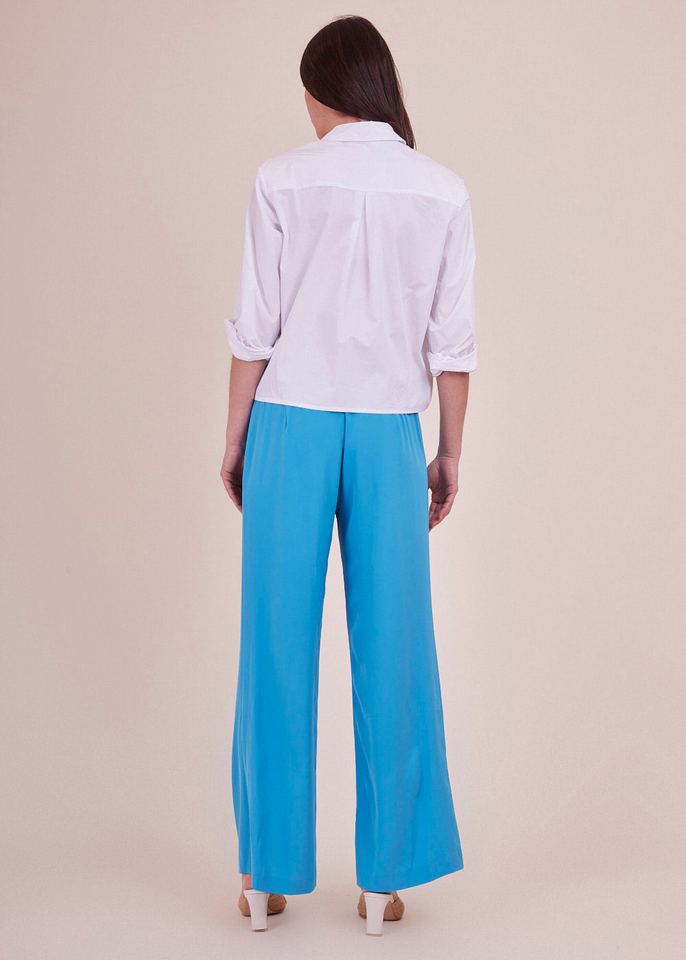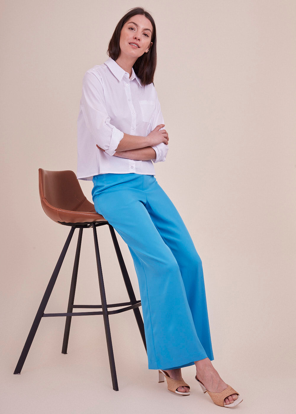 Eine elegante Begleiterin: die Hose mit weitem Bein punktet mit ihrer Ausstrahlung. Der wunderschöne blau Ton erinnert an das Meer. Besonders schön in der Kombination mit einem Absatzschuh. Ein echter Traum.