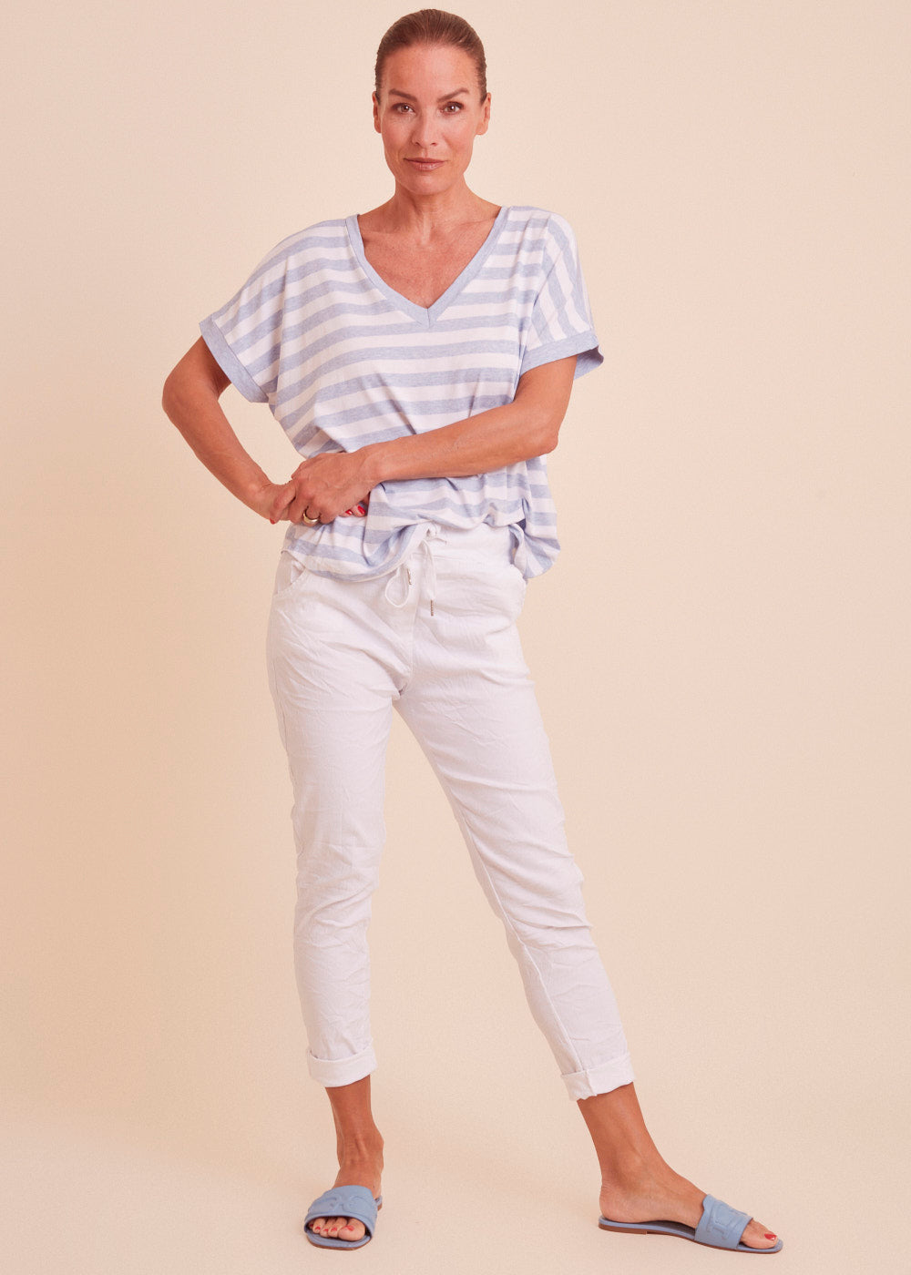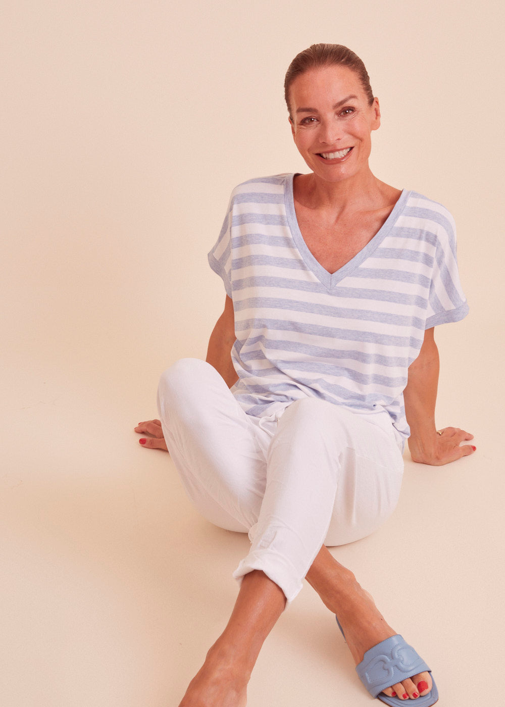 Wir lieben unsere Ringelshirts! Das wunderschön geschnittene Shirt mit V-Ausschnitt, lässt dich Strahlen. Die frischen Farben passen perfekt in den Sommer und lassen sich hervorragend mit weiß formatieren.