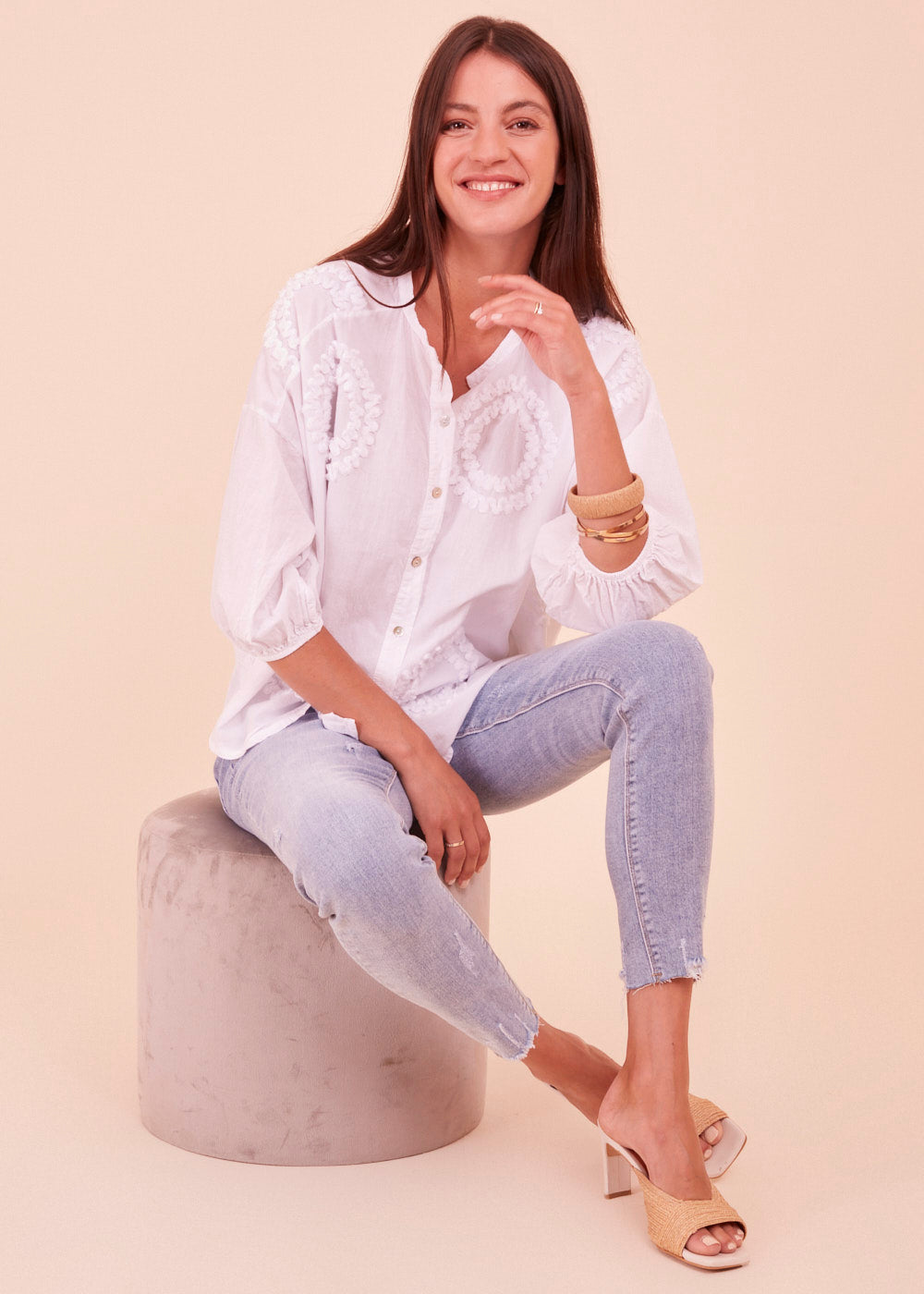 Entdecken Sie unsere wunderschöne bestickte Bluse - eine bezaubernde Verbindung von zeitloser Eleganz und handwerklicher Finesse. Diese Bluse ist eine Hommage an die Kunst der Stickerei und verkörpert raffinierten Stil, der jeden Look aufwertet. Unsere bestickte Bluse besteht aus hochwertiger, leichter Baumwolle, die ein angenehmes Tragegefühl und eine luftige Leichtigkeit bietet. Das zarte Gewebe schmiegt sich sanft an die Haut und sorgt dafür, dass Sie sich den ganzen Tag über wohl und frei fühlen.