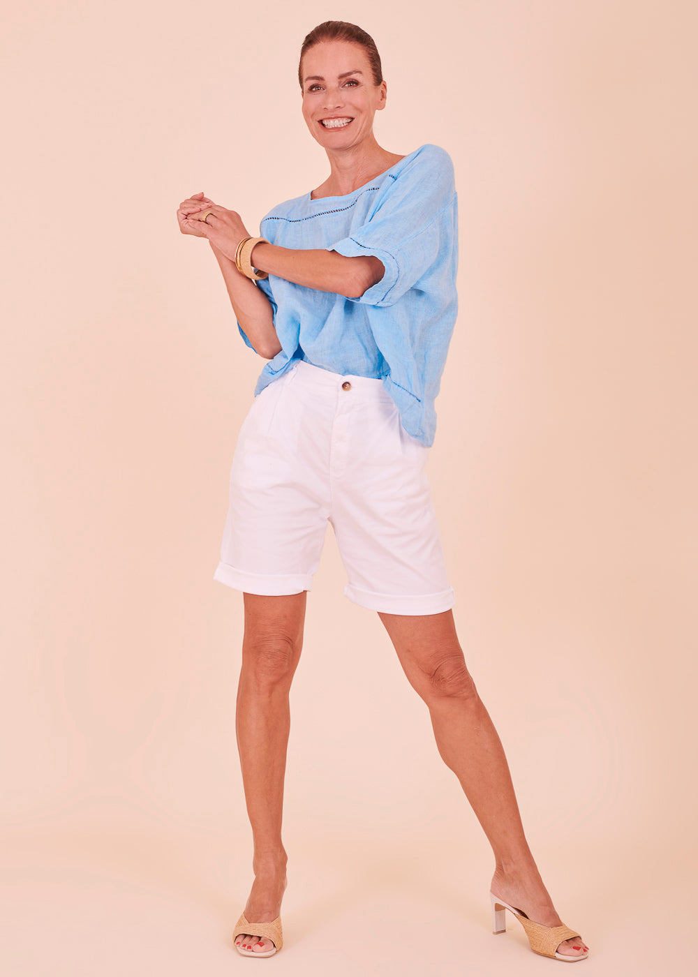 Lässig geschnittene Bermuda-Shorts mit seitlichen Eingriffstaschen. Die Shorts ist höher geschnitten. Dank der Passform ist sie genau das Richtige für dich, wenn du Hosen magst, die locker sitzen und nicht einengen.