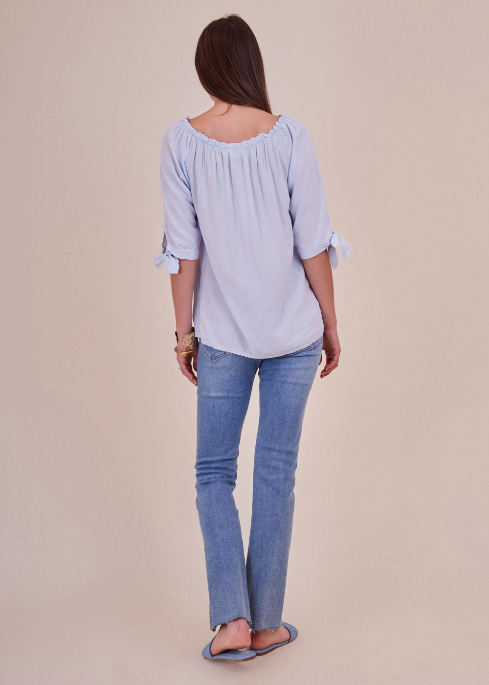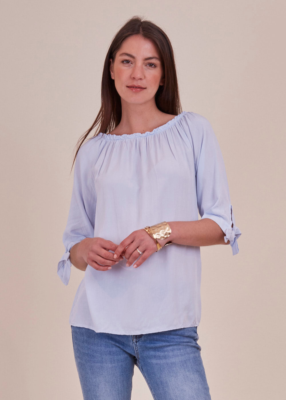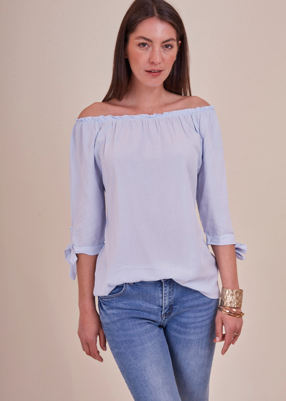 Leichte Carmenbluse in einem wunderschönen blau Ton. Die Bluse hat einen Rundhals-Ausschnitt mit Gummizug, der variable auch mit entblößten Schultern getragen werden kann. Die 3/4- Ärmel sind mit einer Schleife versehen.