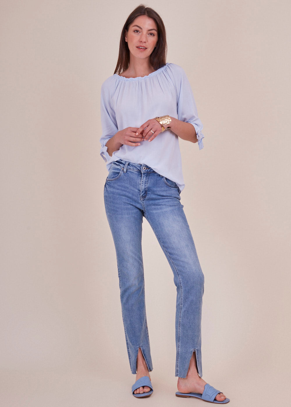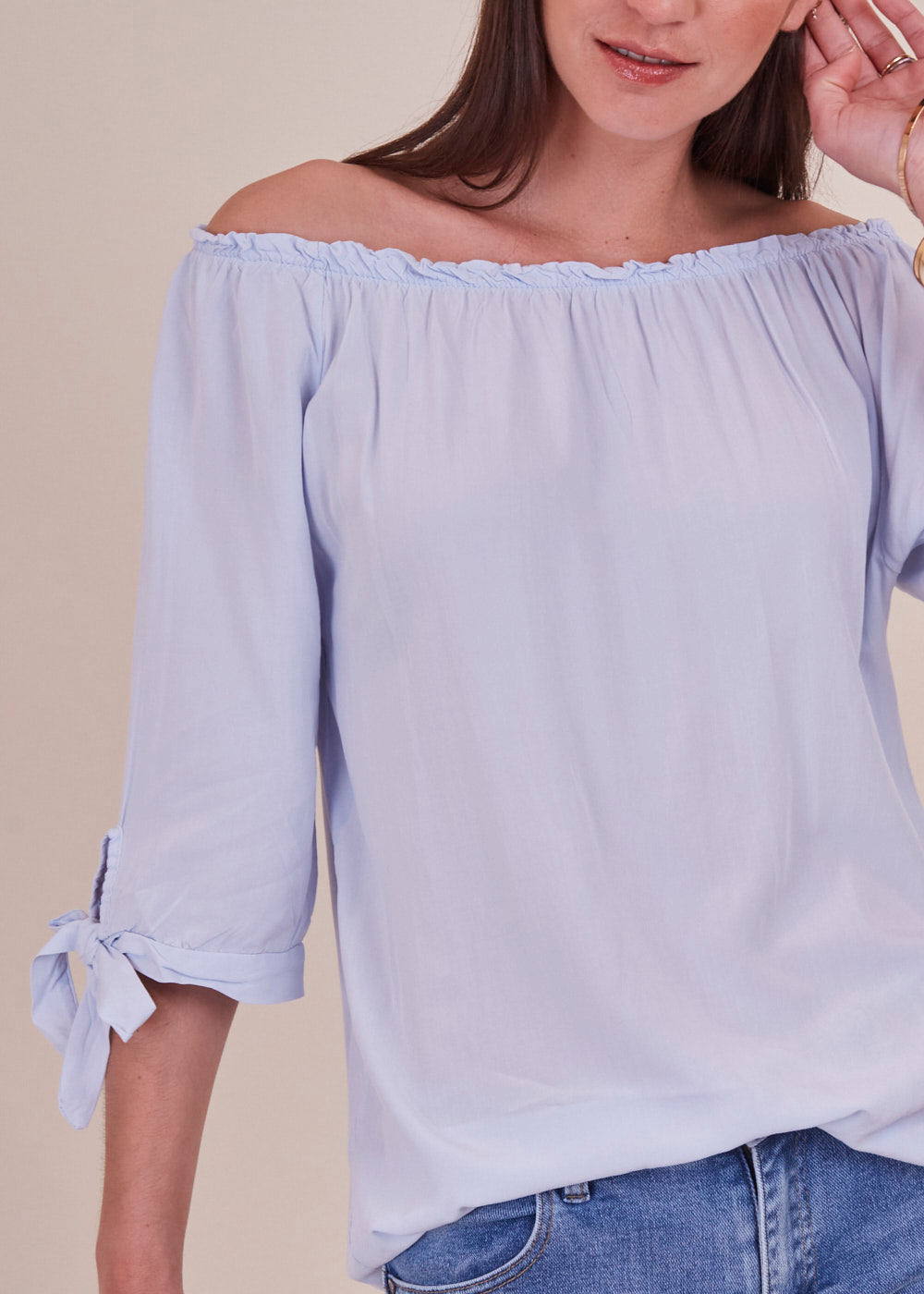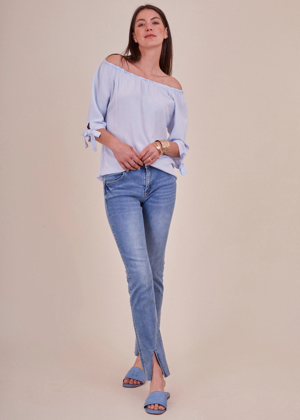 Leichte Carmenbluse in einem wunderschönen blau Ton. Die Bluse hat einen Rundhals-Ausschnitt mit Gummizug, der variable auch mit entblößten Schultern getragen werden kann. Die 3/4- Ärmel sind mit einer Schleife versehen.