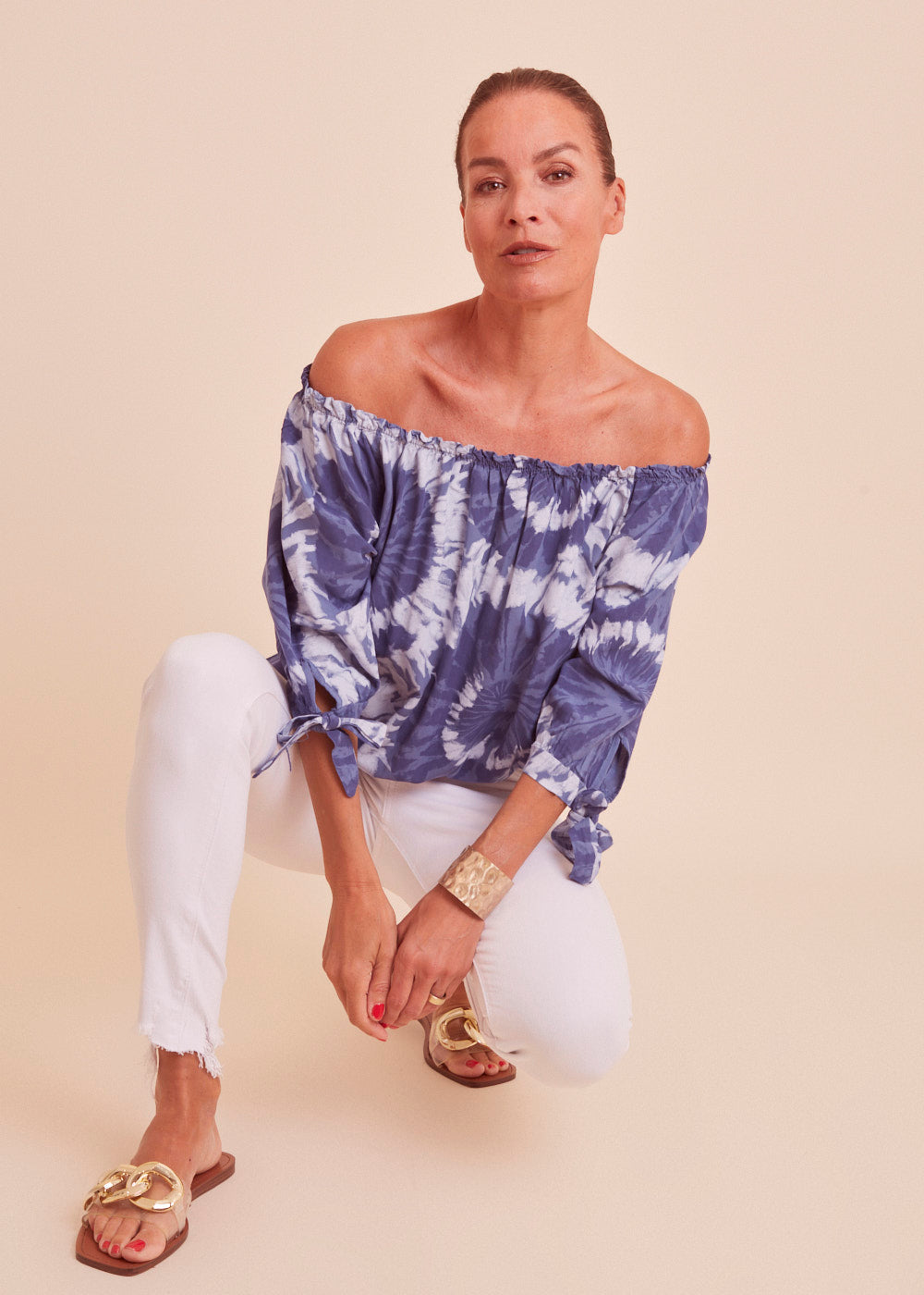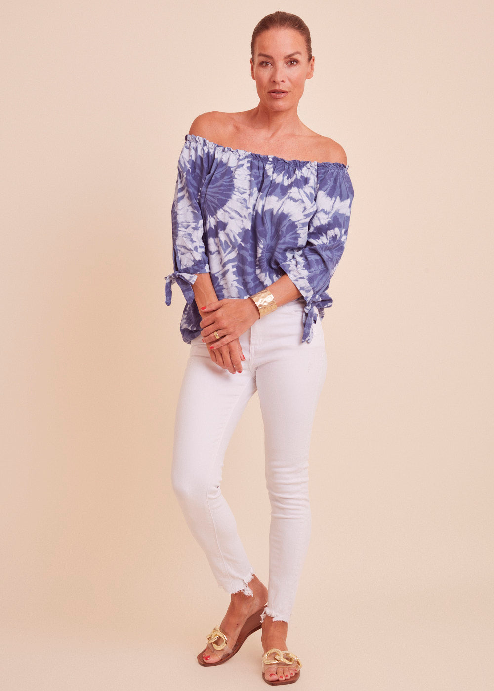 Leichte Carmenbluse in einem wunderschönen blau Ton mit besonderem Print. Die Bluse hat einen Rundhals-Ausschnitt mit Gummizug, der variable auch mit entblößten Schultern getragen werden kann. Die 3/4- Ärmel sind mit einer Schleife versehen. Einfach wunderschön!