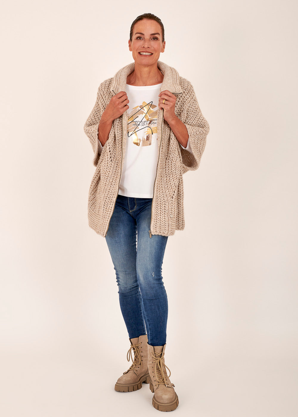 Unser geliebtes Strickcape mit kurzen Armen ist der perfekte Begleiter zum drüber werfen. Er ist mit einem Reißverschluss verschließbar und lässt sich daher auch perfekt geschlossen tragen. Durch sein Unifarbenes Design lässt er sich wunderbar kombinieren und macht dabei noch eine richtig gute Figur. Mit diesem extravaganten Strickstück sind wir für alle Fashion-Fälle gewappnet.