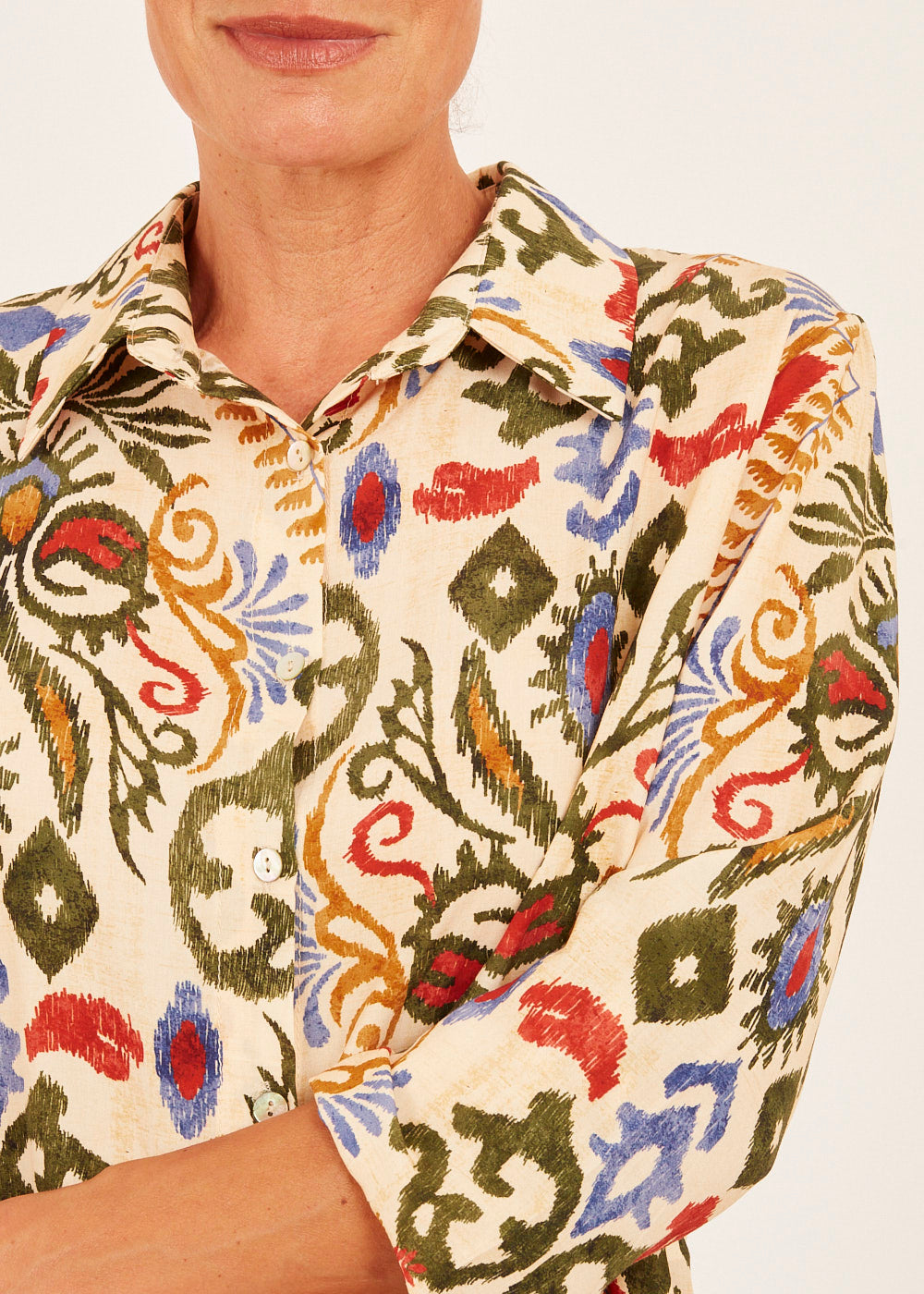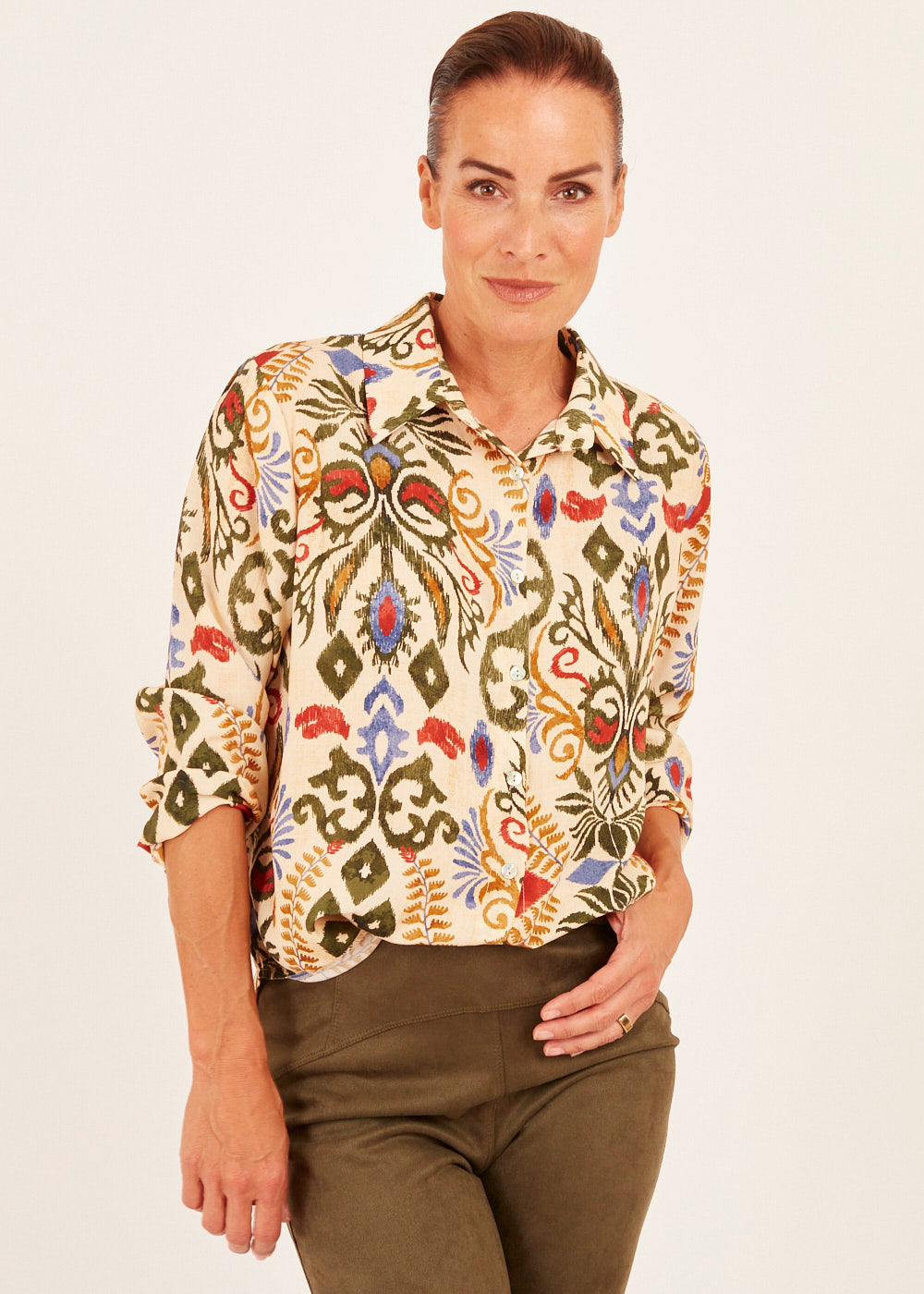 Lässige Viskosebluse mit angesamtem Herbstdruck. In Tunikaform. Mit einer schicken Jacke oder einem Cardigan darüber verwandelst du die Bluse im Handumdrehen in ein wärmendes Outfit für kühlere Herbstabende.