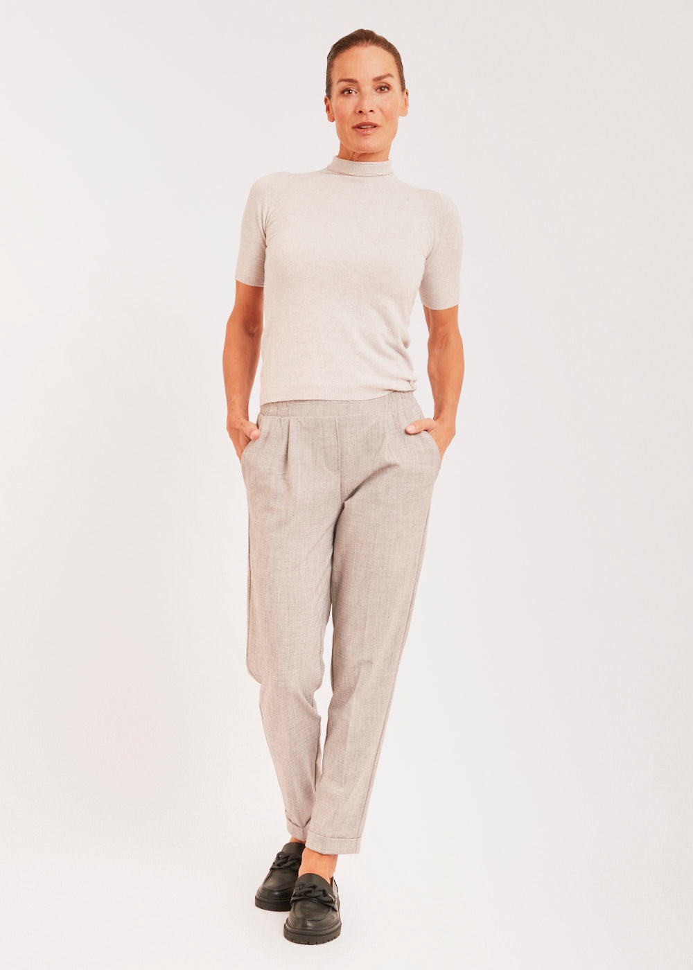 Tolle Bundfaltenhose mit geradem Bein. Die Hose sitzt besonders lässig durch seinen Gummizug und hat seitliche Eingriffstaschen. Besonders toll in Kombination mit dem passenden Blazer und einer weißen Bluse. Einfach lässig und stylisch.