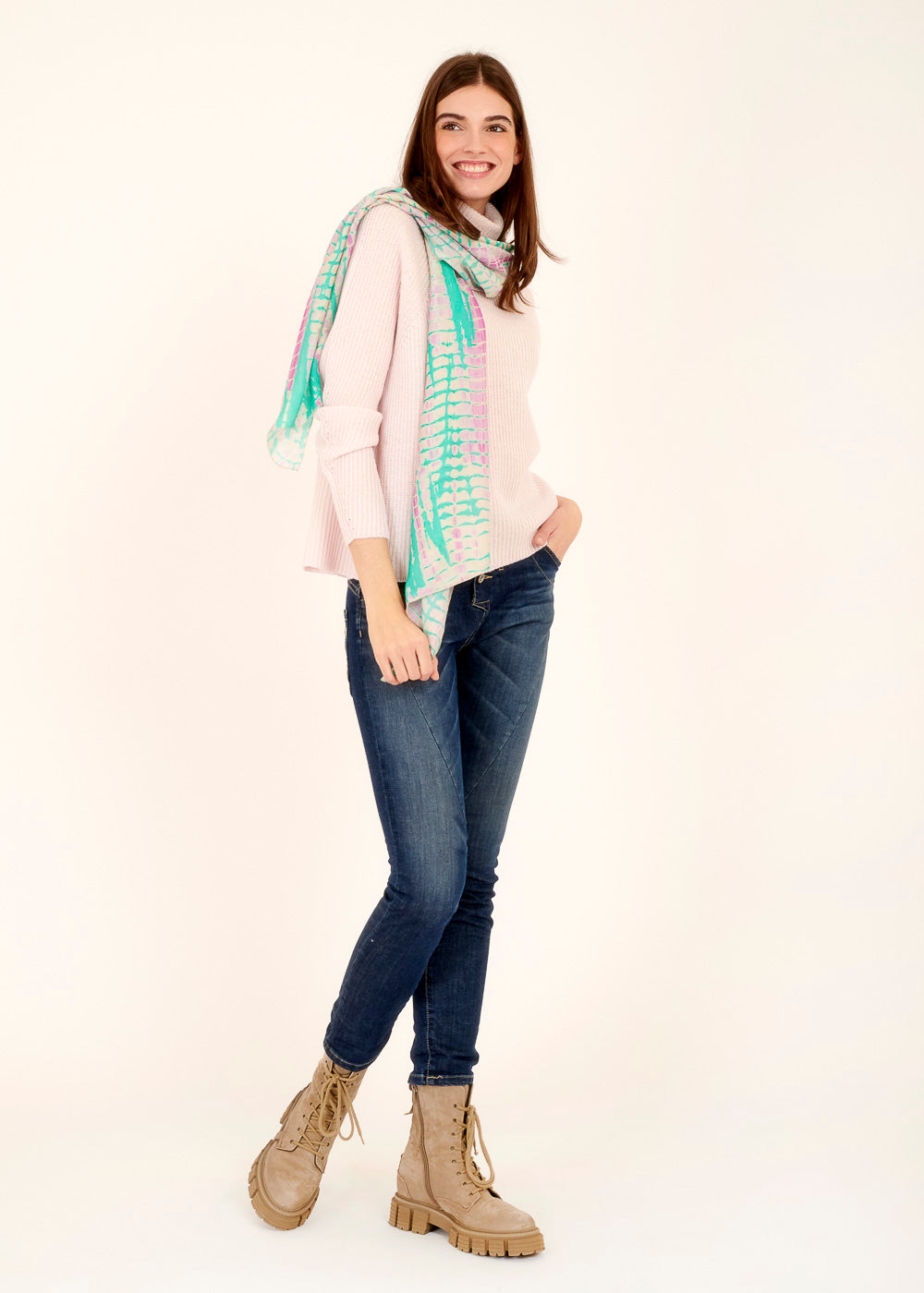 Das Model trägt bei einer Körpergröße von 179 cm die Konfektionsgröße S.