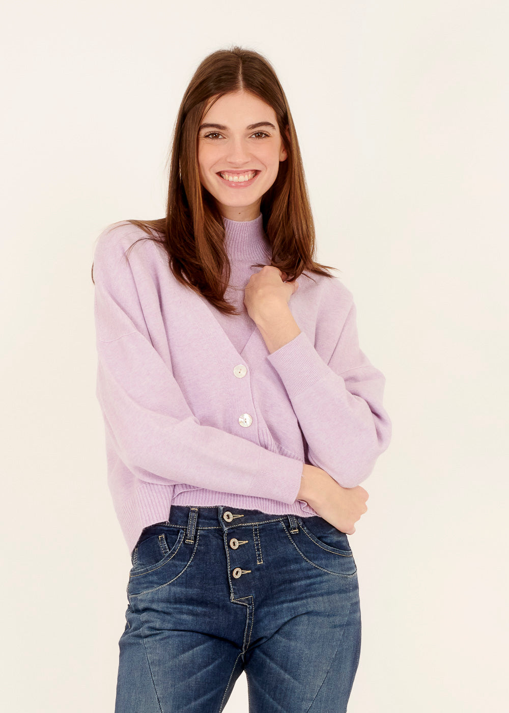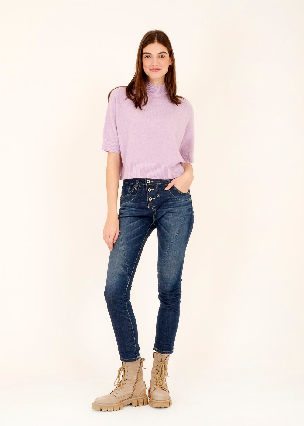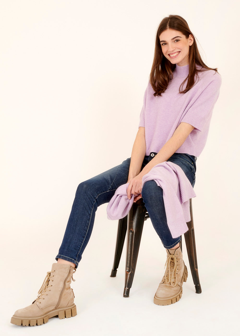 Kurz geschnittener Pullover mit kurzen Armen. Rippenbündchen an den Ärmeln und am Saum. Durch seine Länge eignet er sich besonders gut für höher geschnittenen Jeans. Wir haben auch die passende Strickjacke in unserem Shop.