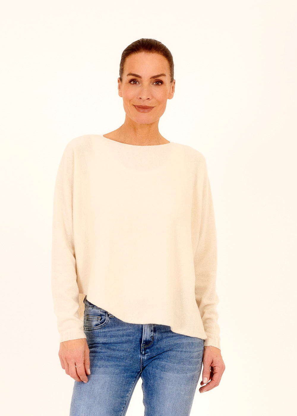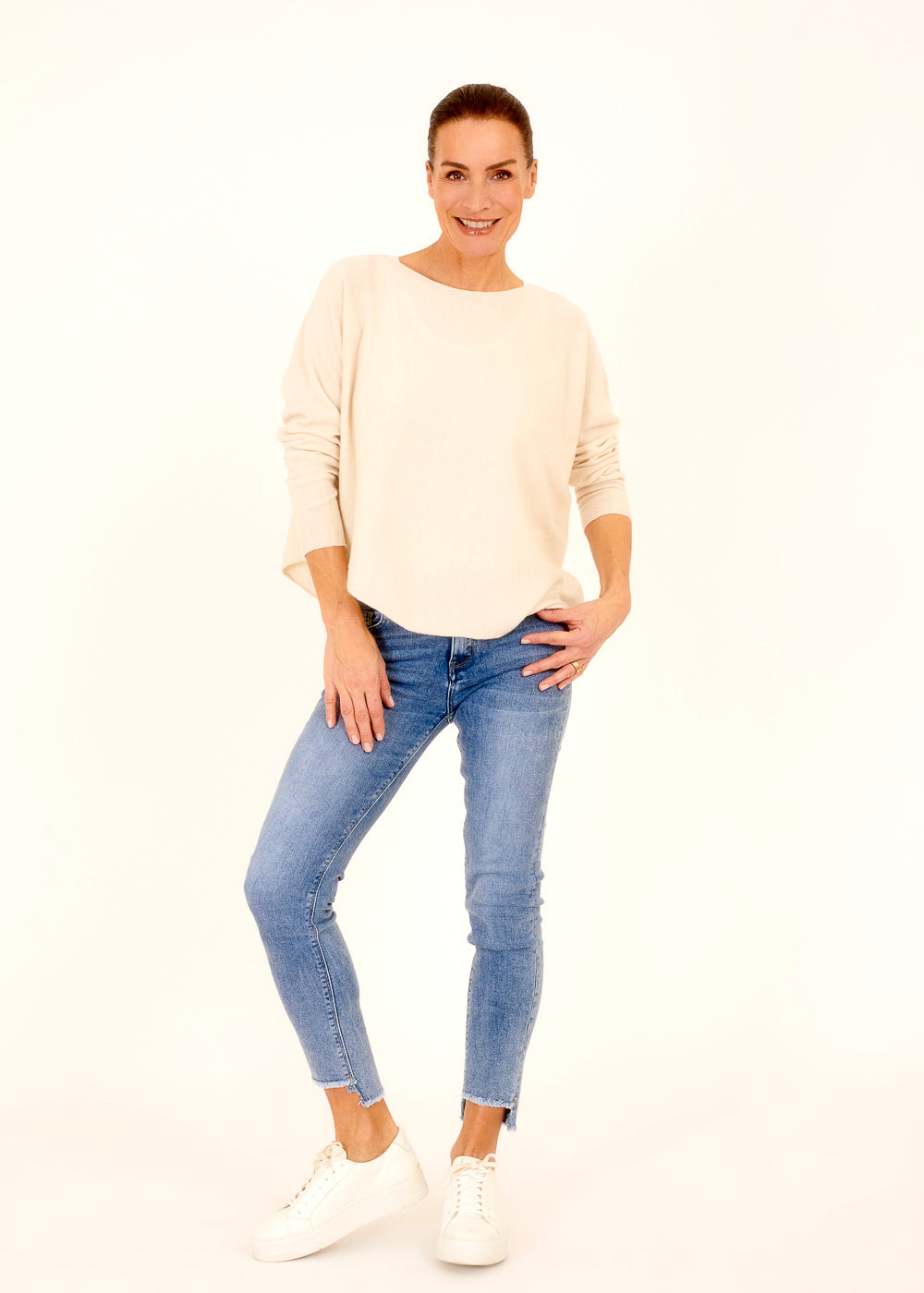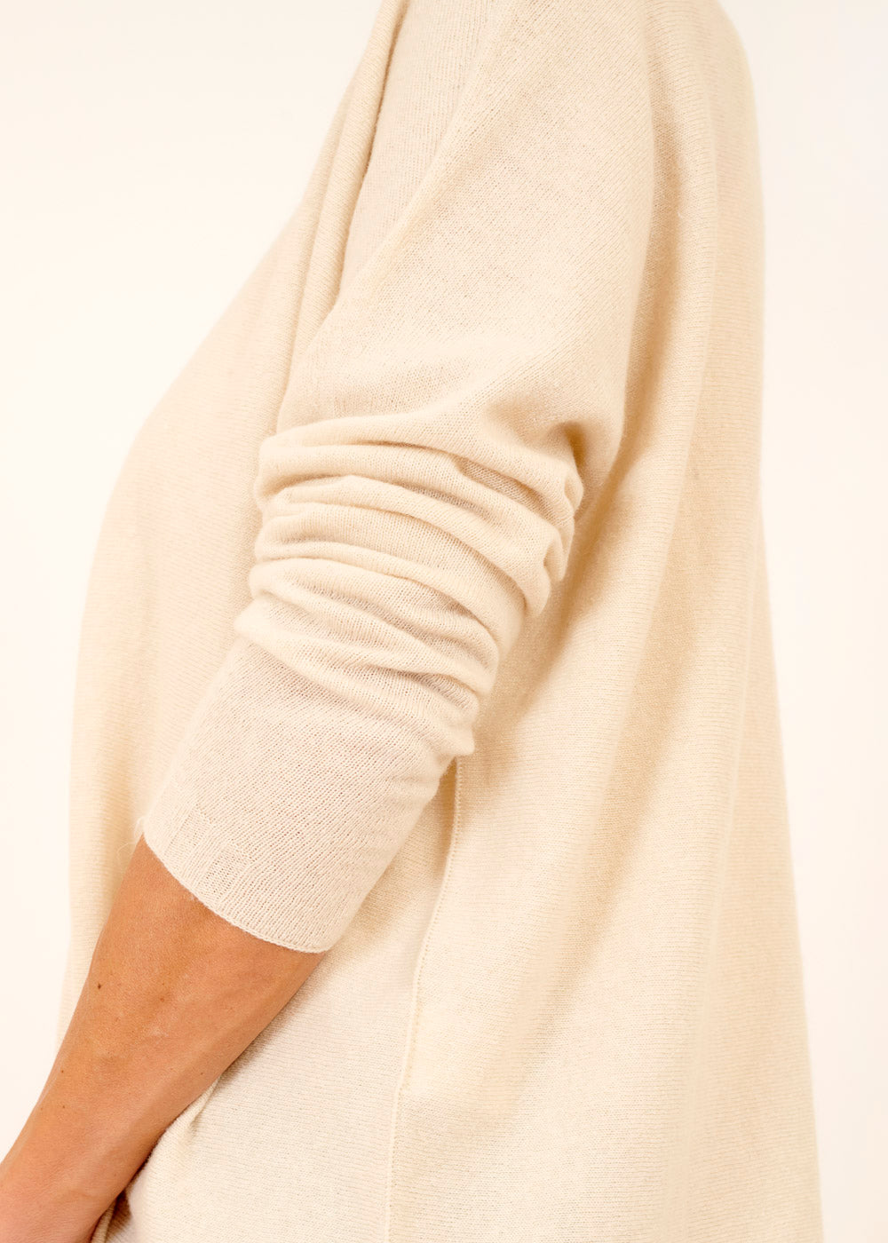 Erfahre zeitgemäße Eleganz mit unserem asymmetrisch geschnittenen beigen Pullover aus hochwertigem Mischgewebe. Der moderne Schnitt verleiht Ihrem Look eine edle Note, während die dezente Farbe Beige Vielseitigkeit und Stil miteinander verbindet.