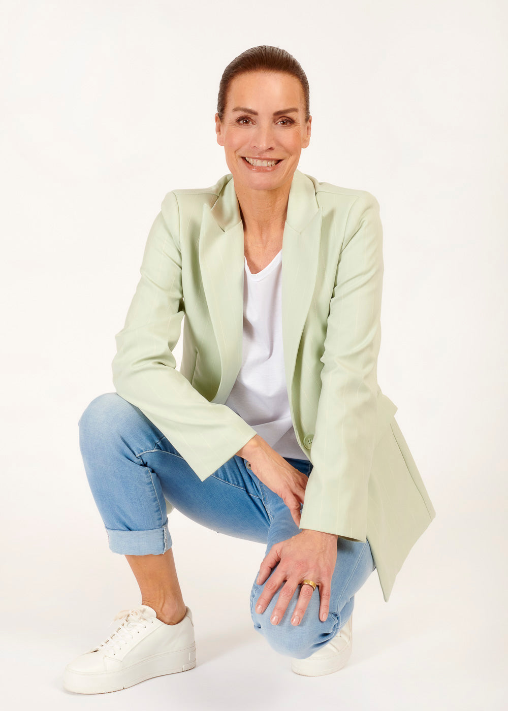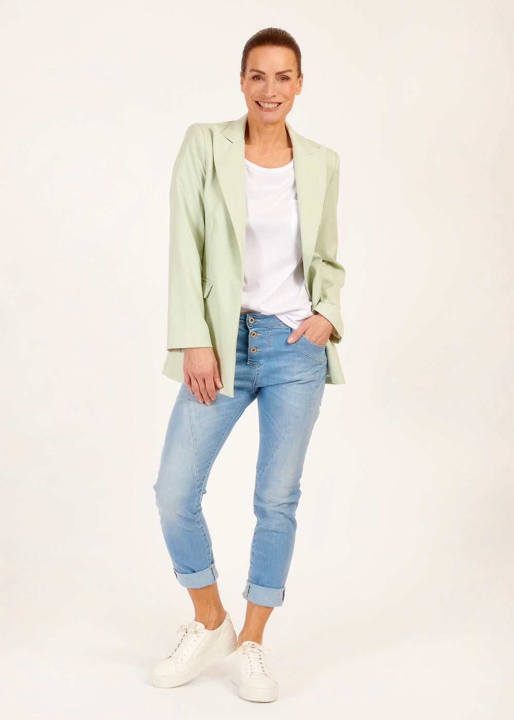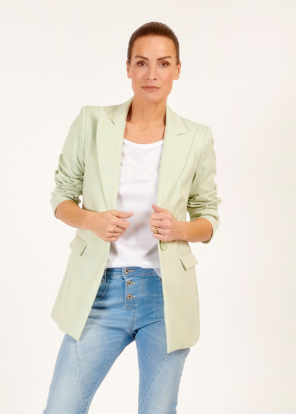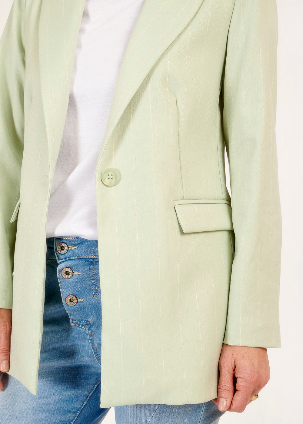 Mit seinem zeitlosen Design und seiner vielseitigen Farbe ist dieser Blazer das perfekte Kleidungsstück, um deinem Look einen Hauch von Frische und Raffinesse zu verleihen. Also gönn dir diesen stylishen Blazer und zeige deine individuelle Note mit Stil!