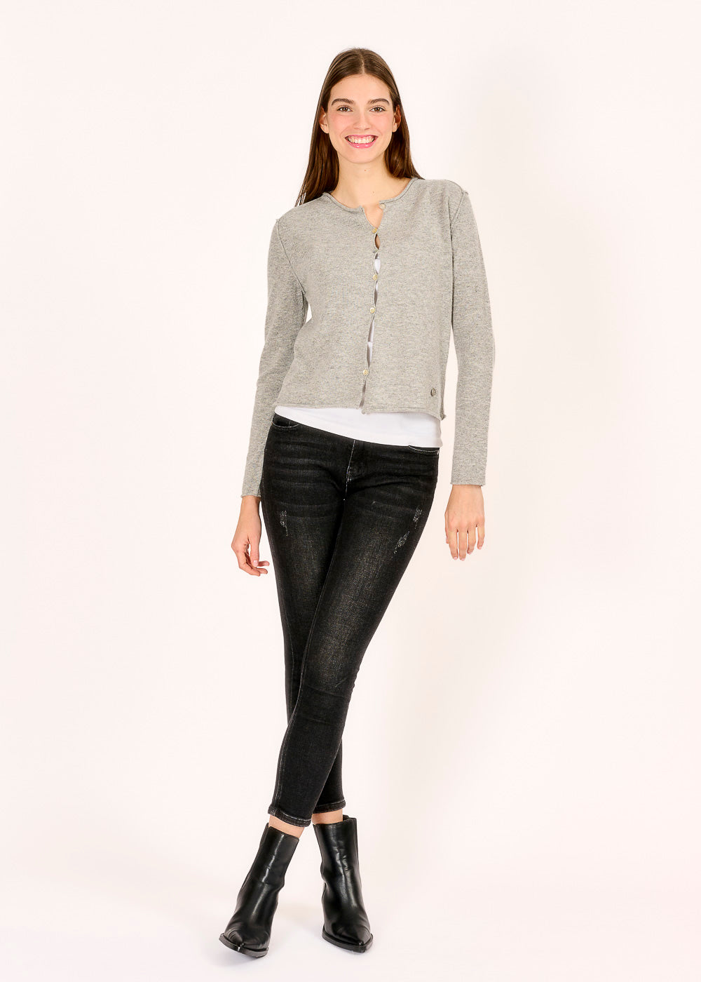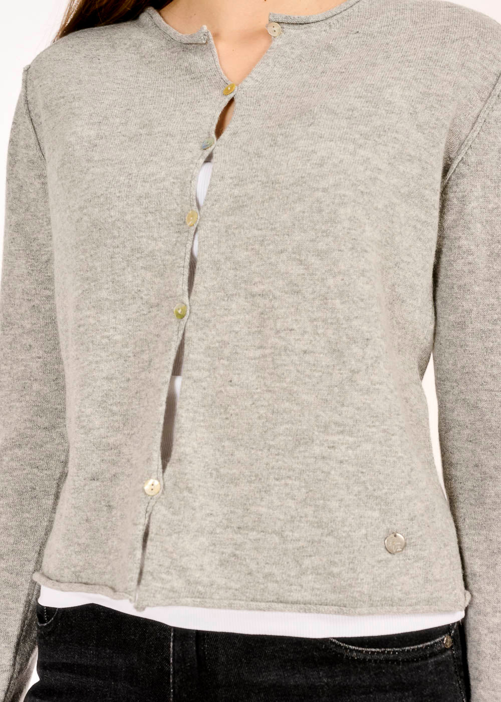 Kuschelig, stylish und vielseitig: Der graue Cardigan mit edler Rollkante passt perfekt zu deinem Look – ob lässig oder elegant. Einfach überwerfen und wohlfühlen!