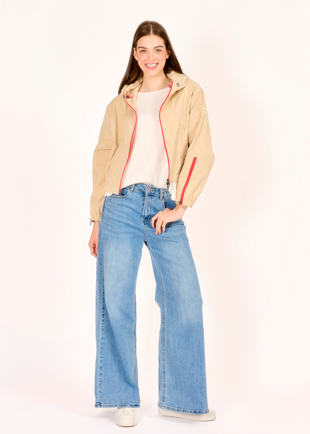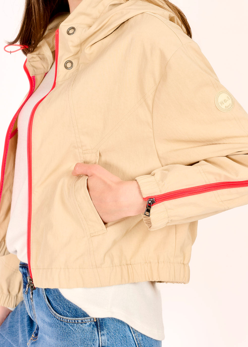 Diese kurze, lässige Baumwolljacke in der Farbe Sand ist der perfekte Begleiter für wechselhaftes Wetter. Dank ihres winddichten und wasserabweisenden Materials bietet sie optimalen Schutz, während der farblich abgesetzte Reißverschluss und die schrägen Eingriffstaschen für einen modernen Look sorgen. Die ungefütterte, leichte Qualität macht sie ideal für die Übergangszeit und vielseitig kombinierbar.