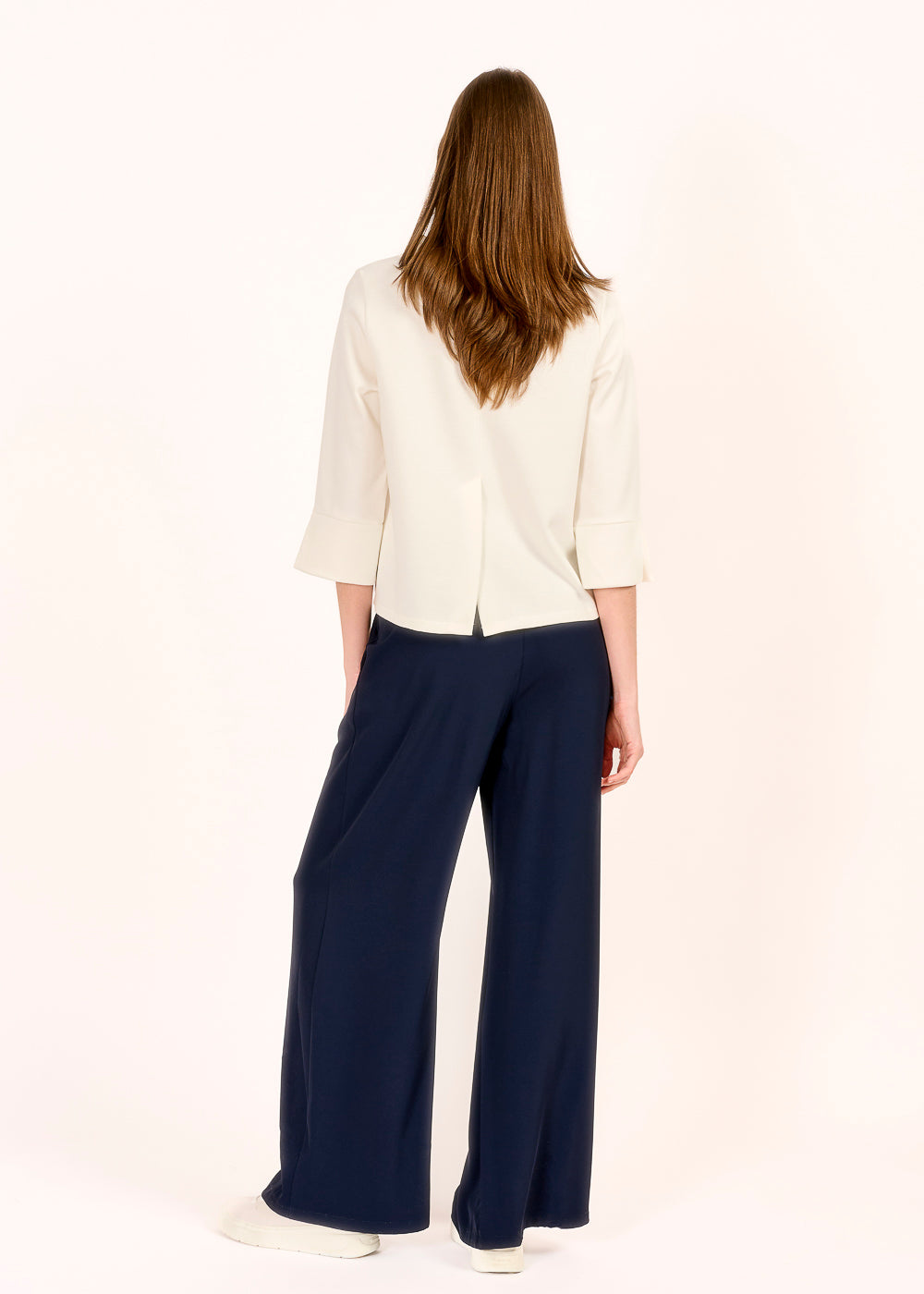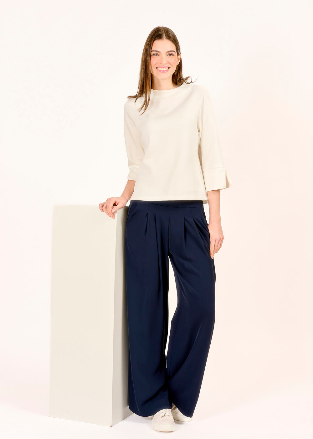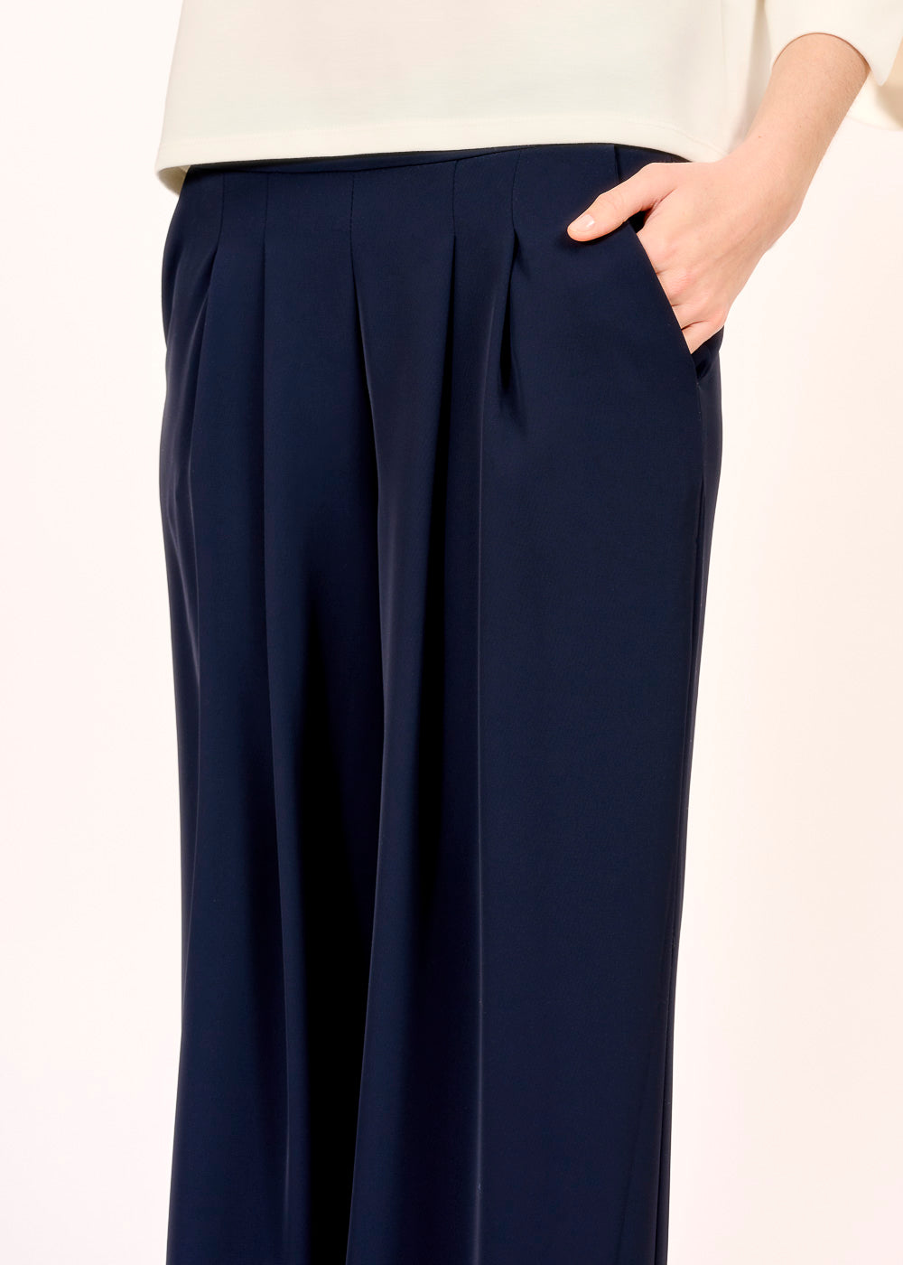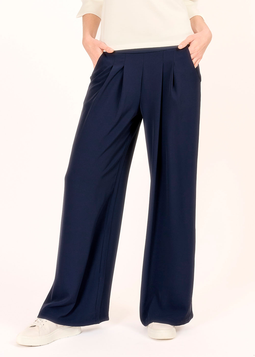 Diese fließende Hose in der edlen Farbe Blu Scuro besticht durch ihr weites Bein und eine elegante Silhouette. Zwei Bundfalten am oberen Teil sorgen für einen stilvollen Fall und einen bequemen Sitz. Ideal für lässige Alltagslooks oder schicke Auftritte mit modischem Anspruch.