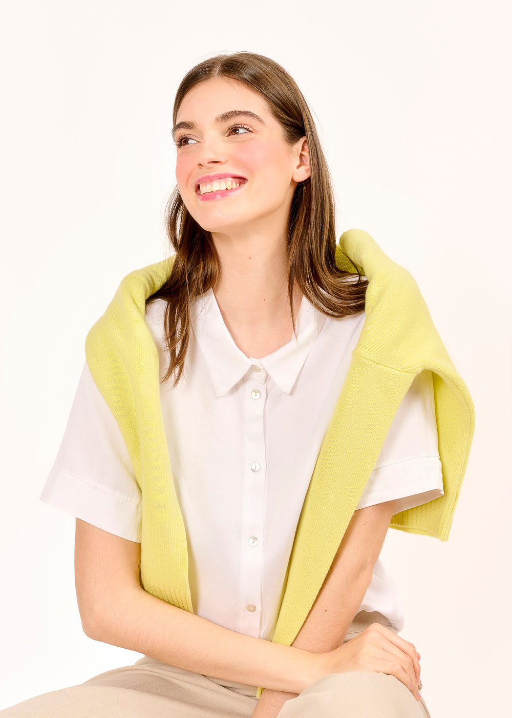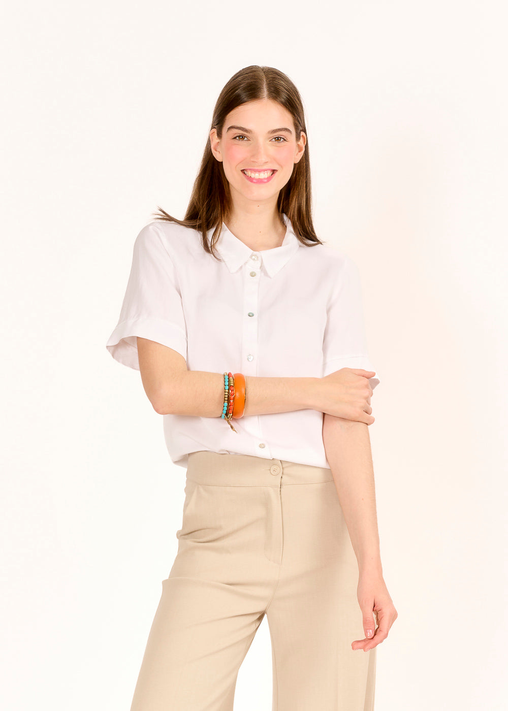 Diese weiße Bluse mit kleinem Kragen besticht durch ihre schlichte Eleganz und ihren modernen Schnitt. Der tiefer geschnittene Kragen sorgt für einen dezenten, schönen Ausschnitt, der das Design besonders feminin macht. Mit ihren halblangen Ärmeln ist sie ein vielseitiges Essential für stilvolle Looks.