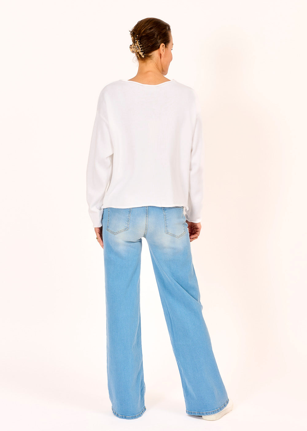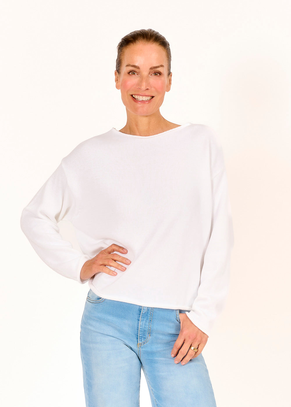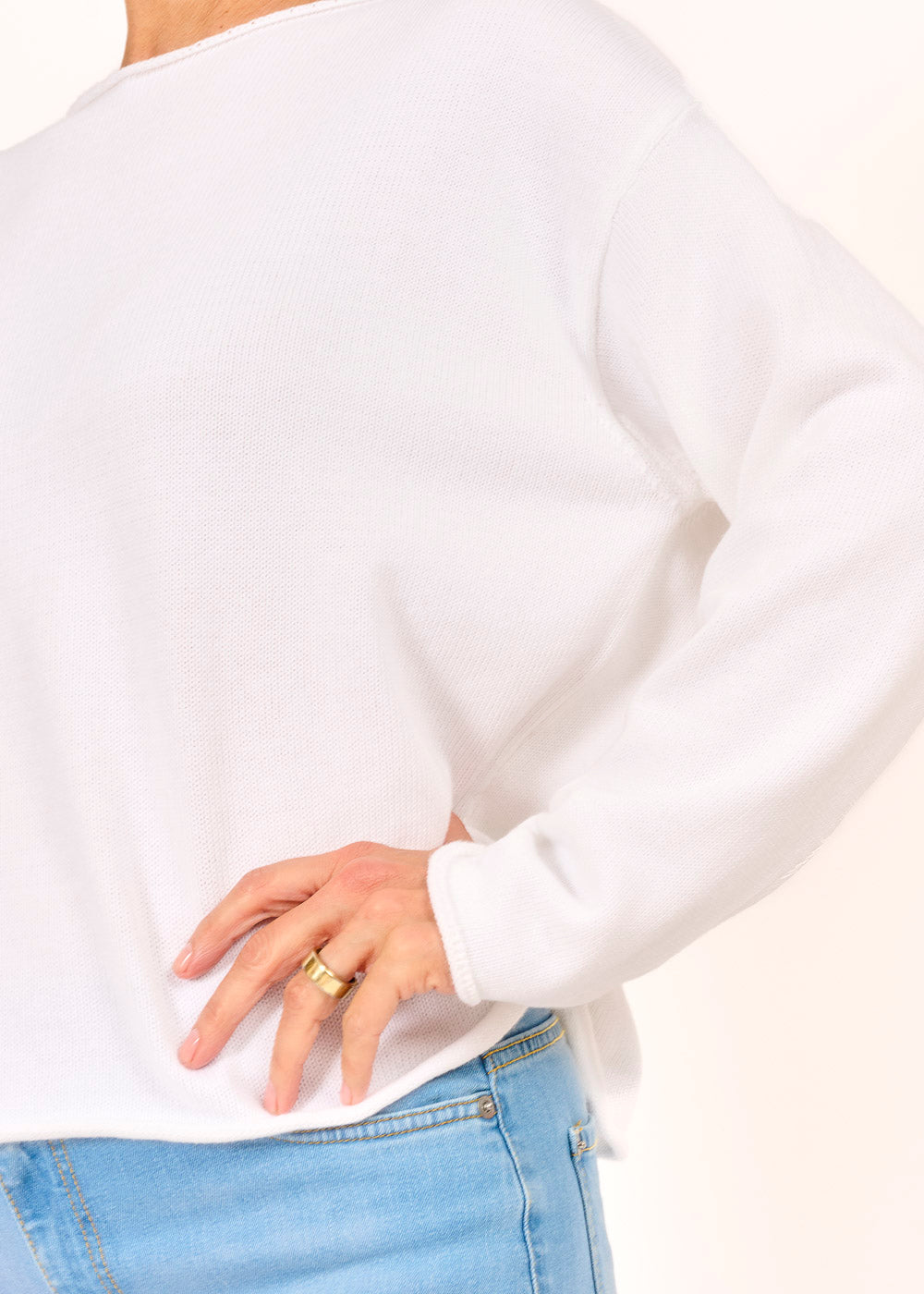 Dieser weiße Baumwollpullover ist ein unkomplizierter Allrounder für entspannte Everyday-Looks. Die soften Rollkanten verleihen ihm einen modernen, lässigen Touch. Aus reiner Baumwolle gefertigt, fühlt er sich angenehm auf der Haut an und lässt sich vielseitig kombinieren.