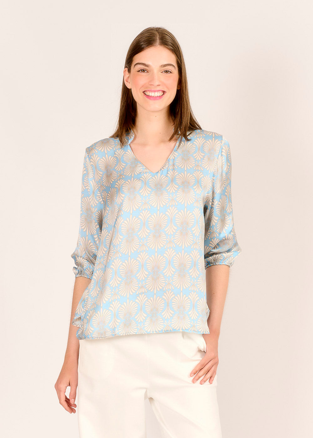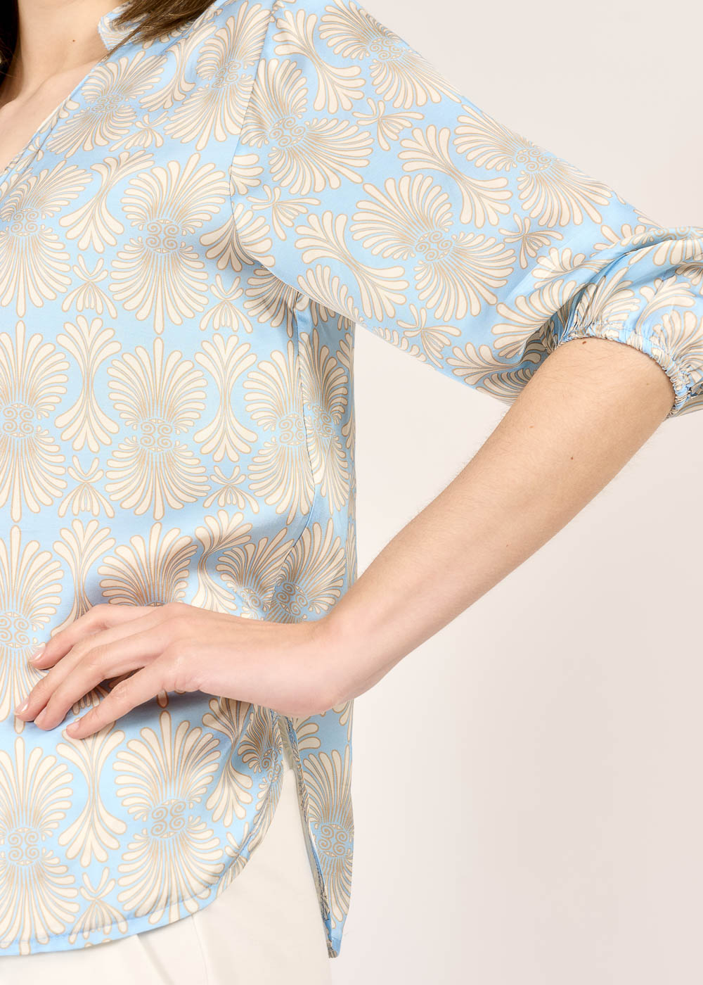 Diese Tunika-Bluse mit beige-blauem Print begeistert mit einem stilvollen Muster und einem leichten, fließenden Fall. Die 3/4-Ärmel mit Gummizug bieten Komfort und Flexibilität – ideal für wechselhaftes Wetter. Für einen rundum abgestimmten Look lässt sie sich perfekt mit der passenden Hose kombinieren.