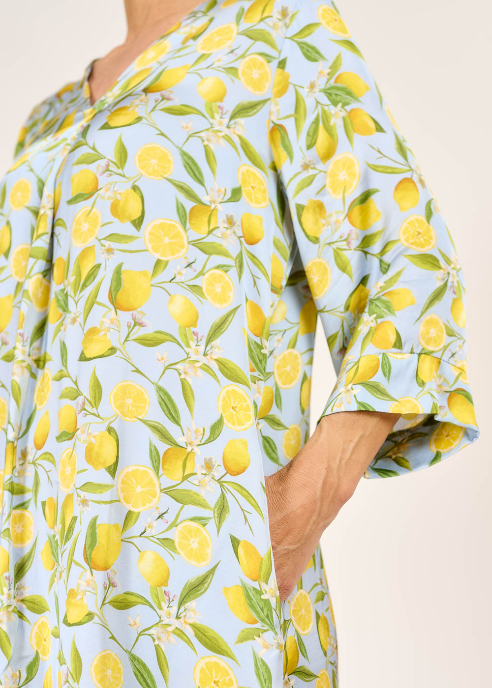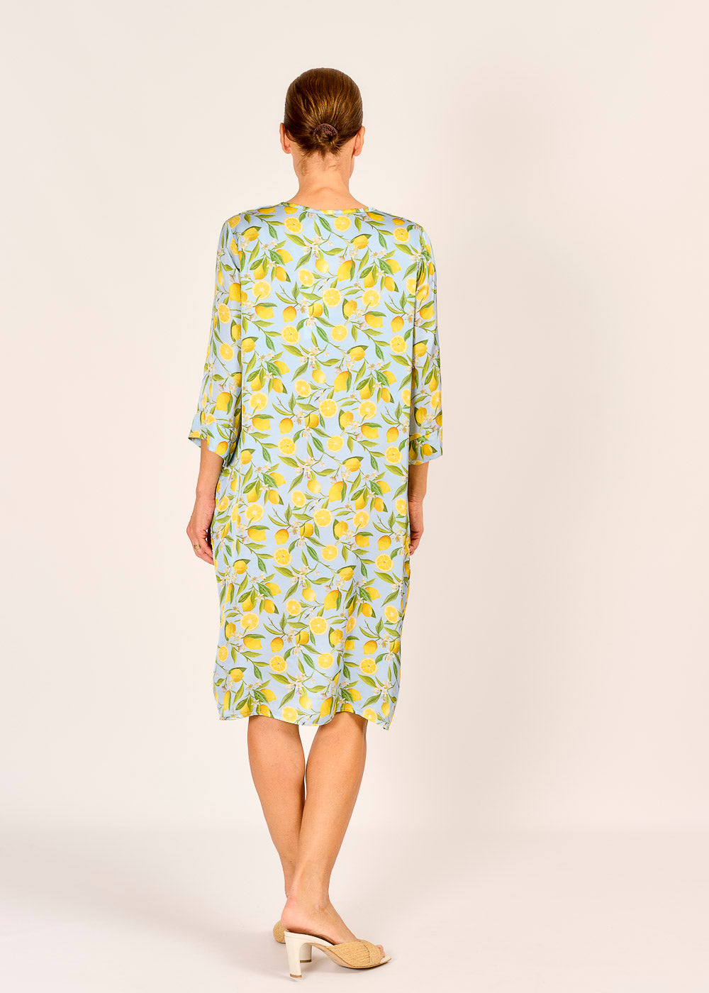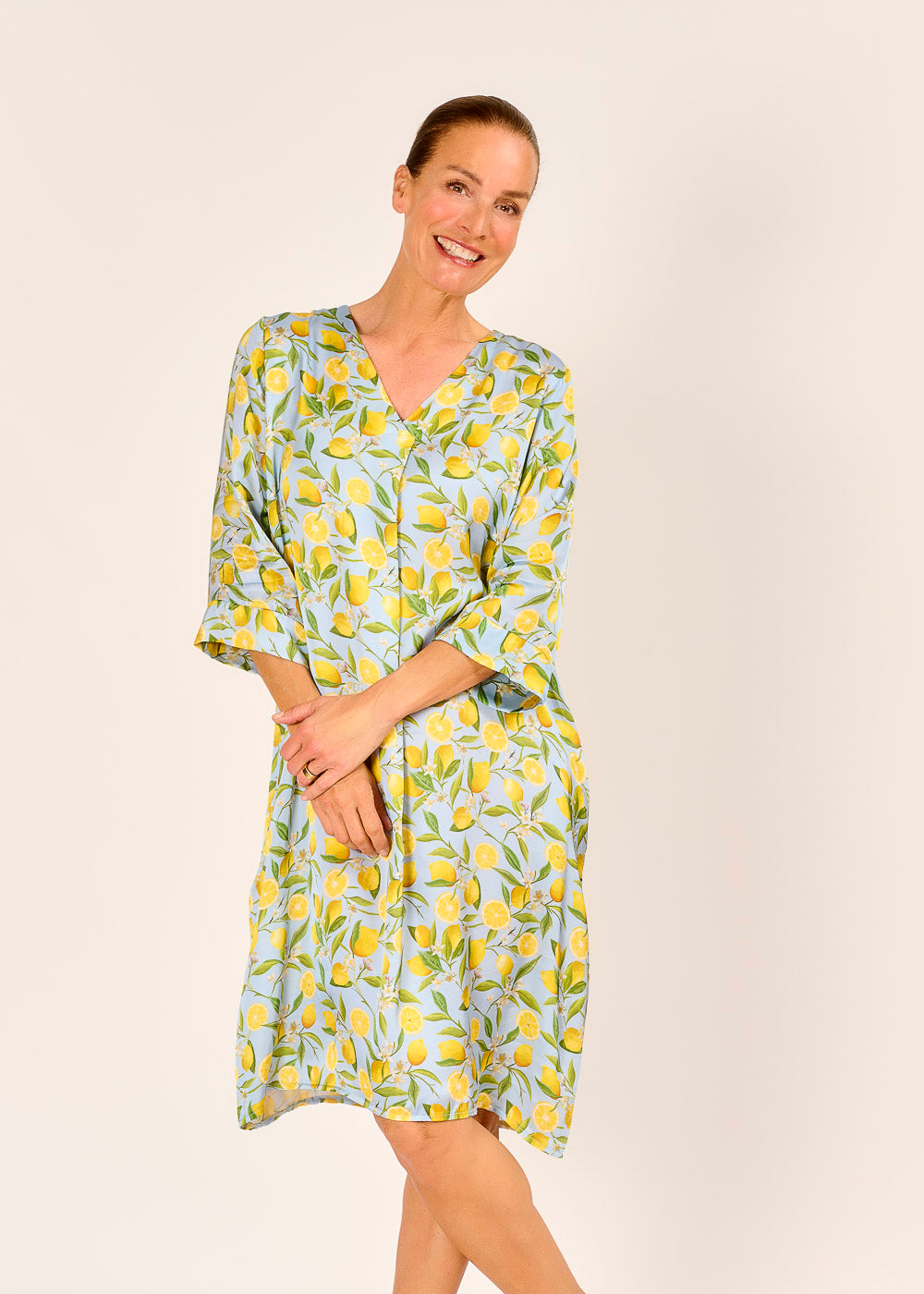 Dieses charmante Druckkleid mit Zitronen-Print versprüht sofort gute Laune und weckt die Vorfreude auf sonnige Tage und mediterrane Nächte. Der fröhliche Zitronenmuster auf hellblauem Grund macht es zu einem echten Blickfang, der Leichtigkeit und Eleganz perfekt vereint. Ob für einen entspannten Stadtbummel oder einen sommerlichen Abend – dieses Kleid ist Ihr idealer Begleiter für einen stilvollen Auftritt.