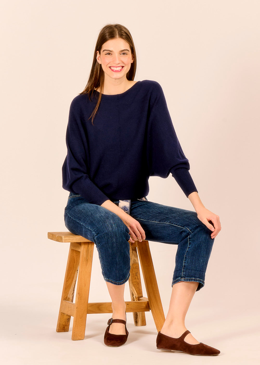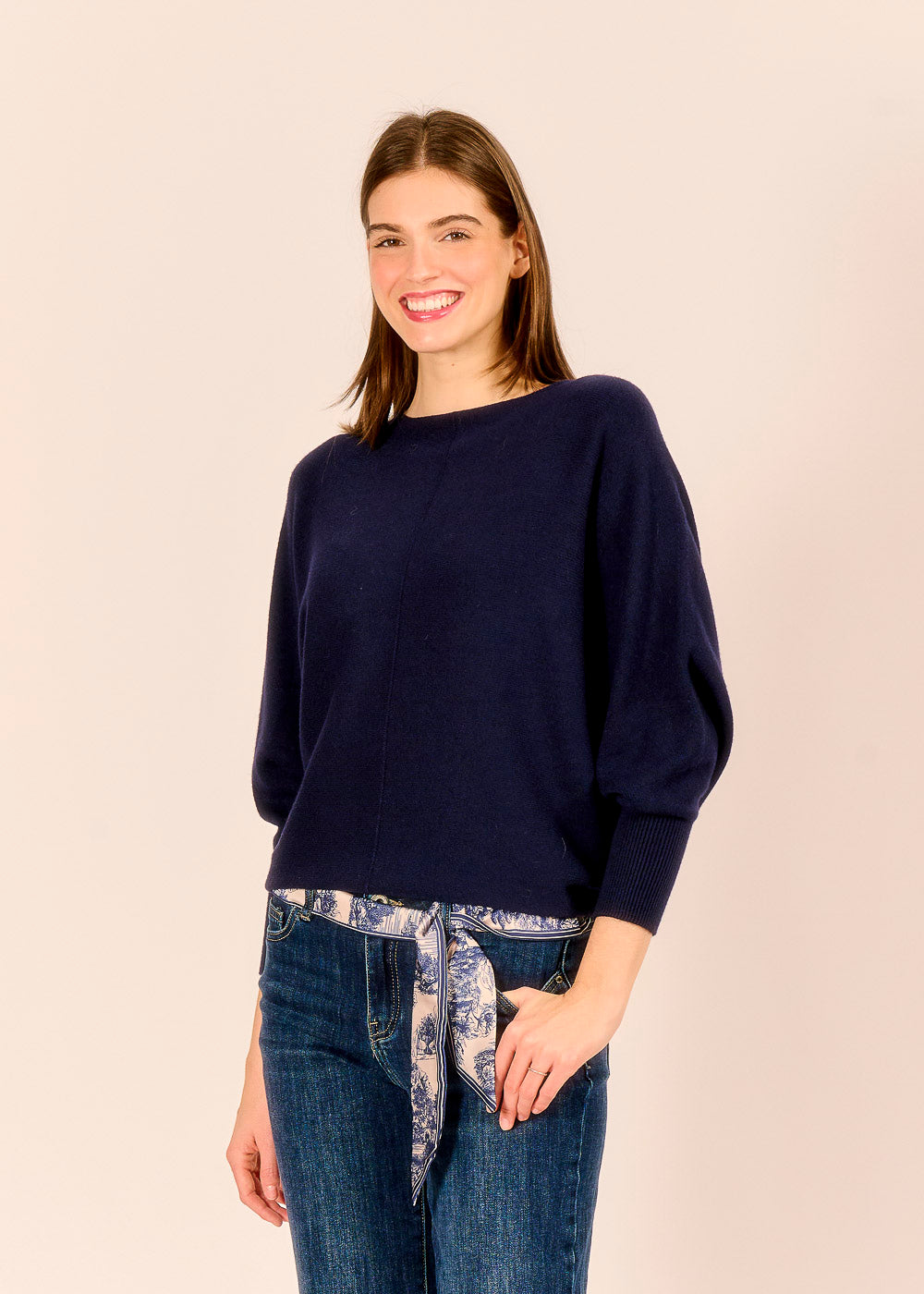 Die Knopfleiste am Rücken verleiht dem Pullover mit weiten Ärmeln in edlem Dunkelblau einen überraschenden Akzent. Weiche Viskose sorgt für ein sanftes, angenehmes Tragegefühl. Ein vielseitiges Lieblingsstück für alle, die besondere Details lieben.